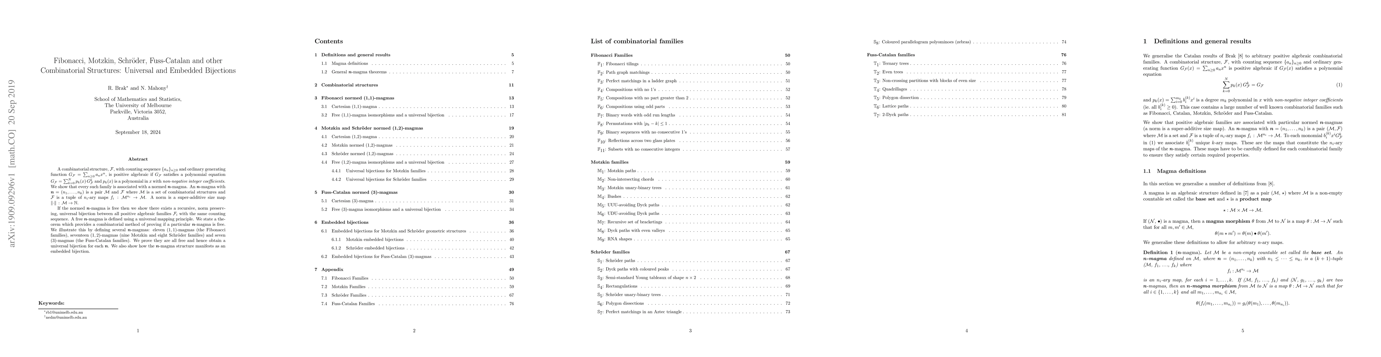 This paper explores combinatorial structures like Fibonacci, Motzkin, Schröder, and Fuss-Catalan sequences, demonstrating that they can be classified as positive algebraic families. It introduces normed $\mathbf{n}$-magmas and proves that free $\mathbf{n}$-magmas have recursive, norm-preserving universal bijections among positive algebraic families with identical counting sequences.