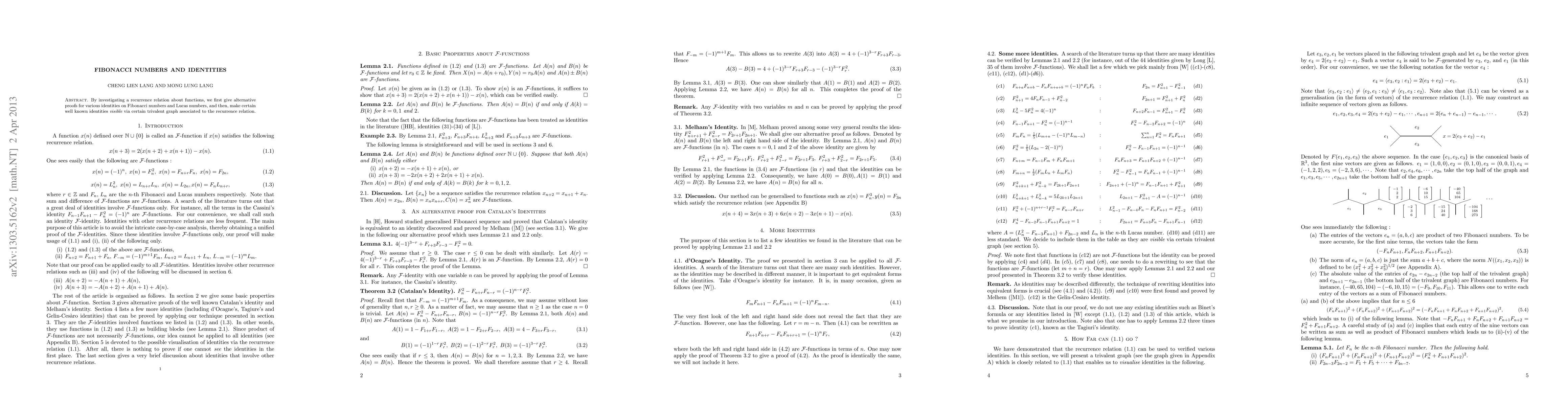 By investigating a recurrence relation about functions, we first give alternative proofs of various identities on Fibonacci numbers and Lucas numbers, and then, make certain well known identities visible via certain trivalent graph associated to the recurrence relation.