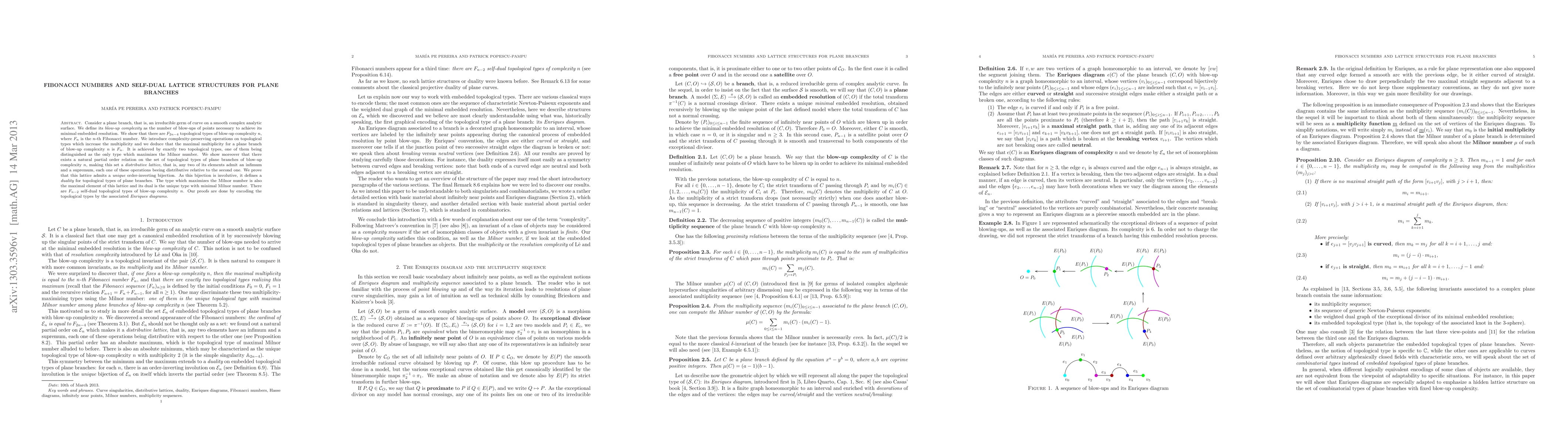 This paper explores the relationship between Fibonacci numbers and the complexity of plane branches in complex analytic surfaces, showing that the number of topological types of blow-up complexity $n$ is $F_{2n-4}$. It introduces a duality for topological types, revealing that there are $F_{n-2}$ self-dual types, and proves that the lattice of these types is distributive and order-inverting.