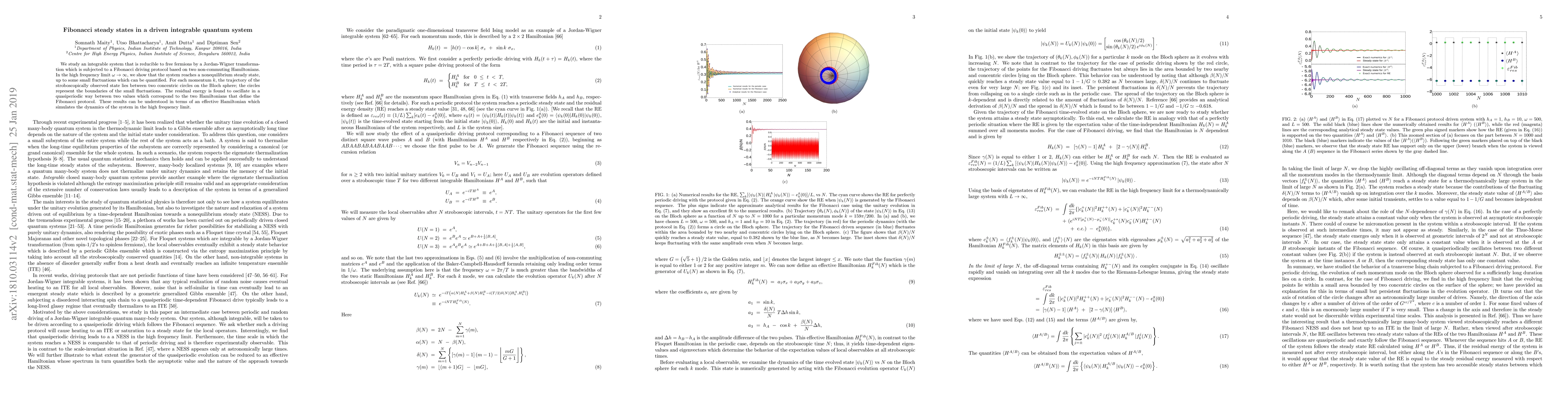 This paper explores an integrable quantum system driven by a Fibonacci protocol, demonstrating that it reaches a non-equilibrium steady state with quasiperiodic fluctuations. The system's dynamics are effectively captured by an approximate Hamiltonian, showing oscillatory residual energy between two values.