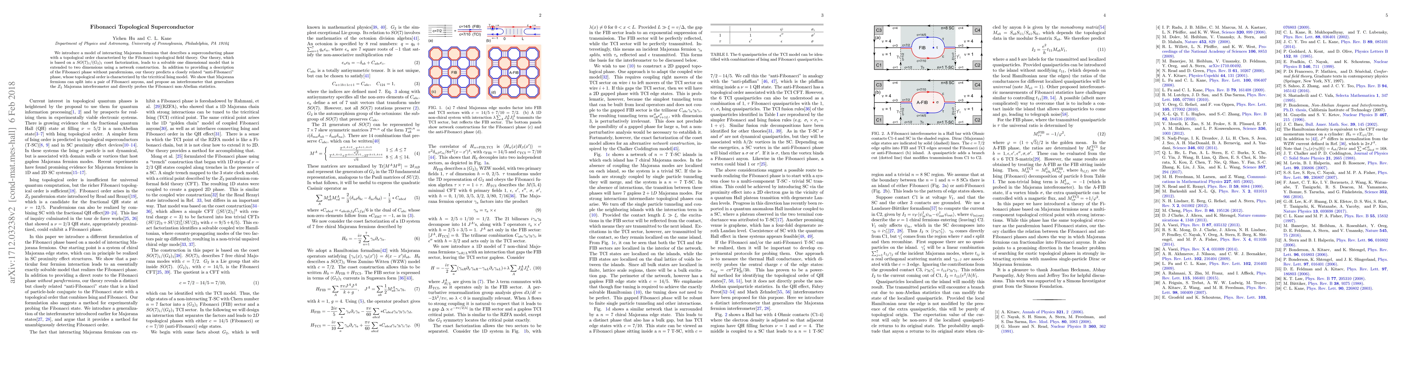We introduce a model of interacting Majorana fermions that describes a superconducting phase with a topological order characterized by the Fibonacci topological field theory. Our theory, which is based on a $SO(7)_1/(G_2)_1$ coset factorization, leads to a solvable one dimensional model that is extended to two dimensions using a network construction. In addition to providing a description of the Fibonacci phase without parafermions, our theory predicts a closely related "anti-Fibonacci" phase, whose topological order is characterized by the tricritical Ising model. We show that Majorana fermions can split into a pair of Fibonacci anyons, and propose an interferometer that generalizes the $Z_2$ Majorana interferometer and directly probes the Fibonacci non-Abelian statistics.