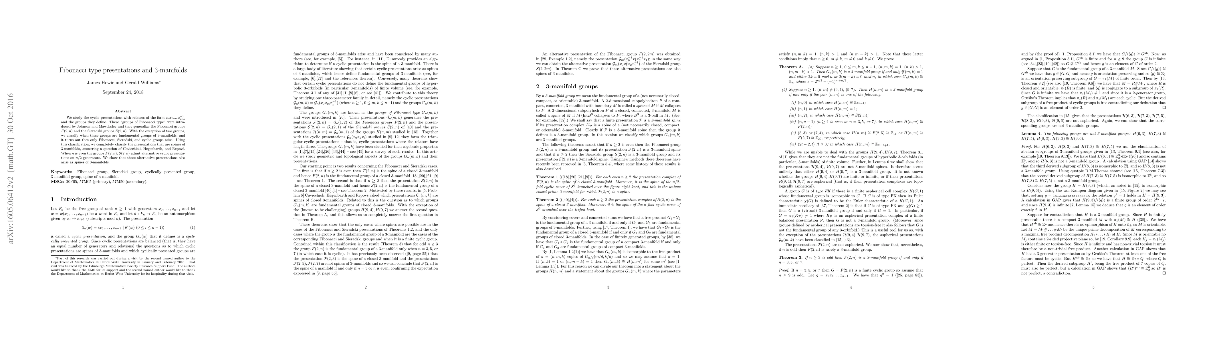 We study the cyclic presentations with relators of the form $x_ix_{i+m}x_{i+k}^{-1}$ and the groups they define. These "groups of Fibonacci type" were introduced by Johnson and Mawdesley and they generalize the Fibonacci groups $F(2,n)$ and the Sieradski groups $S(2,n)$. With the exception of two groups, we classify when these groups are fundamental groups of 3-manifolds, and it turns out that only Fibonacci, Sieradski, and cyclic groups arise. Using this classification, we completely classify the presentations that are spines of 3-manifolds, answering a question of Cavicchioli, Hegenbarth, and Repov\v{s}. When $n$ is even the groups $F(2,n),S(2,n)$ admit alternative cyclic presentations on $n/2$ generators. We show that these alternative presentations also arise as spines of 3-manifolds.