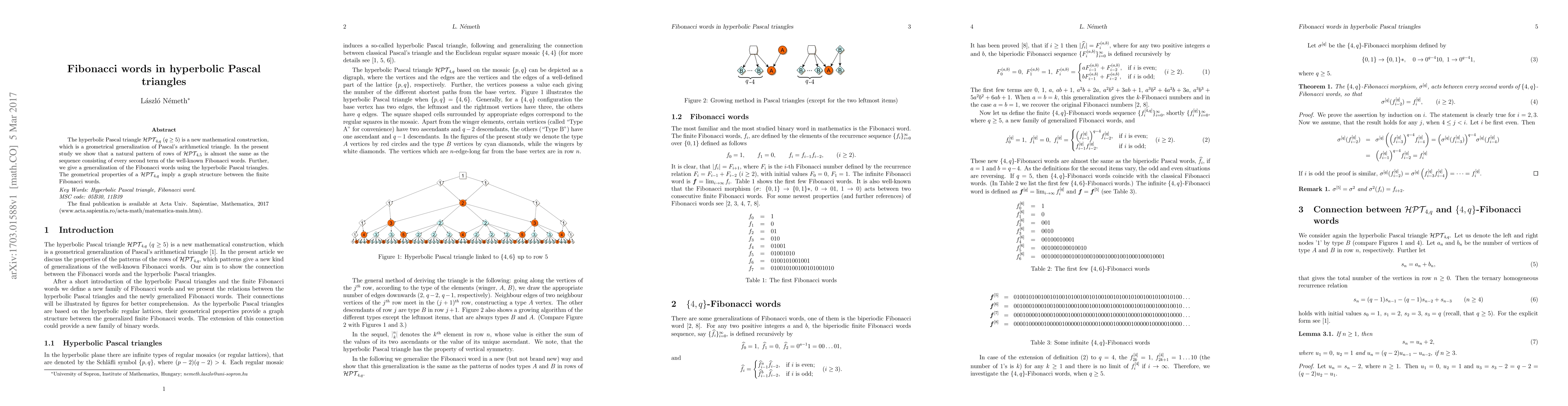 Summary: This paper introduces the hyperbolic Pascal triangle ${\cal HPT}_{4,q}$ as a geometrical generalization of Pascal's triangle, showing a pattern in ${\cal HPT}_{4,5}$ resembling every second term of Fibonacci words and generalizing Fibonacci words using these triangles, while revealing a graph structure between finite Fibonacci words.
