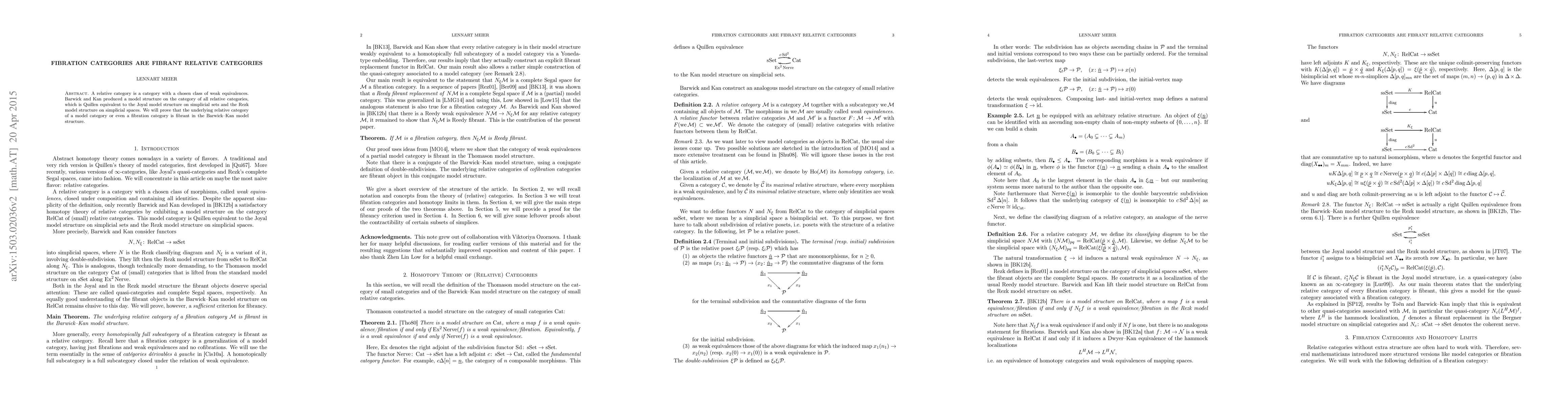 The paper's main technical contribution is the proof that fibration categories are fibrant in the Barwick--Kan model structure, which connects model categorical theory with simplicial sets and simplicial spaces.