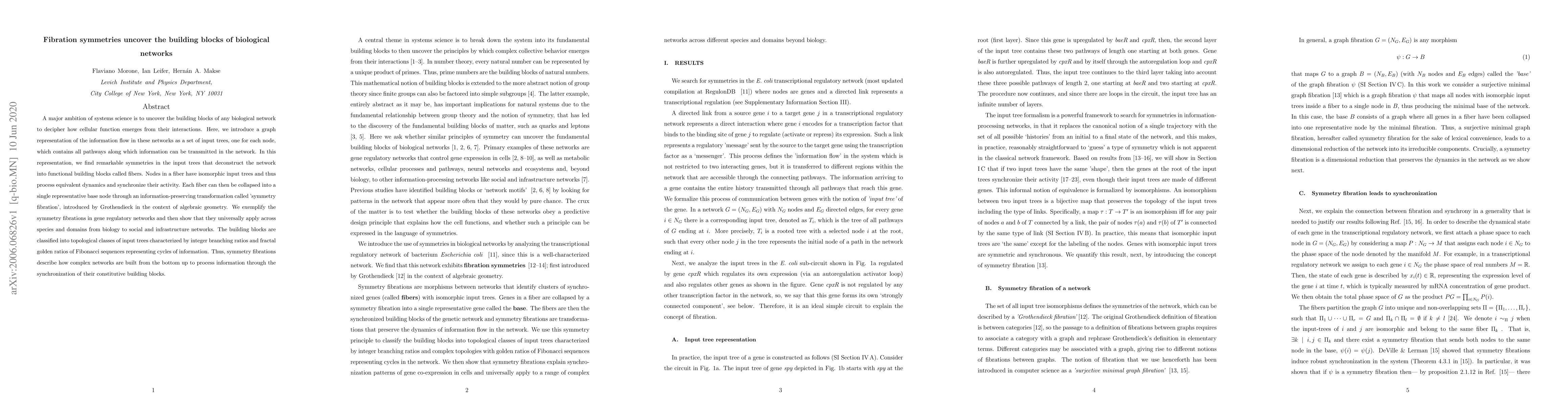 A major ambition of systems science is to uncover the building blocks of any biological network to decipher how cellular function emerges from their interactions. Here, we introduce a graph representation of the information flow in these networks as a set of input trees, one for each node, which contains all pathways along which information can be transmitted in the network. In this representation, we find remarkable symmetries in the input trees that deconstruct the network into functional building blocks called fibers. Nodes in a fiber have isomorphic input trees and thus process equivalent dynamics and synchronize their activity. Each fiber can then be collapsed into a single representative base node through an information-preserving transformation called 'symmetry fibration', introduced by Grothendieck in the context of algebraic geometry. We exemplify the symmetry fibrations in gene regulatory networks and then show that they universally apply across species and domains from biology to social and infrastructure networks. The building blocks are classified into topological classes of input trees characterized by integer branching ratios and fractal golden ratios of Fibonacci sequences representing cycles of information. Thus, symmetry fibrations describe how complex networks are built from the bottom up to process information through the synchronization of their constitutive building blocks.