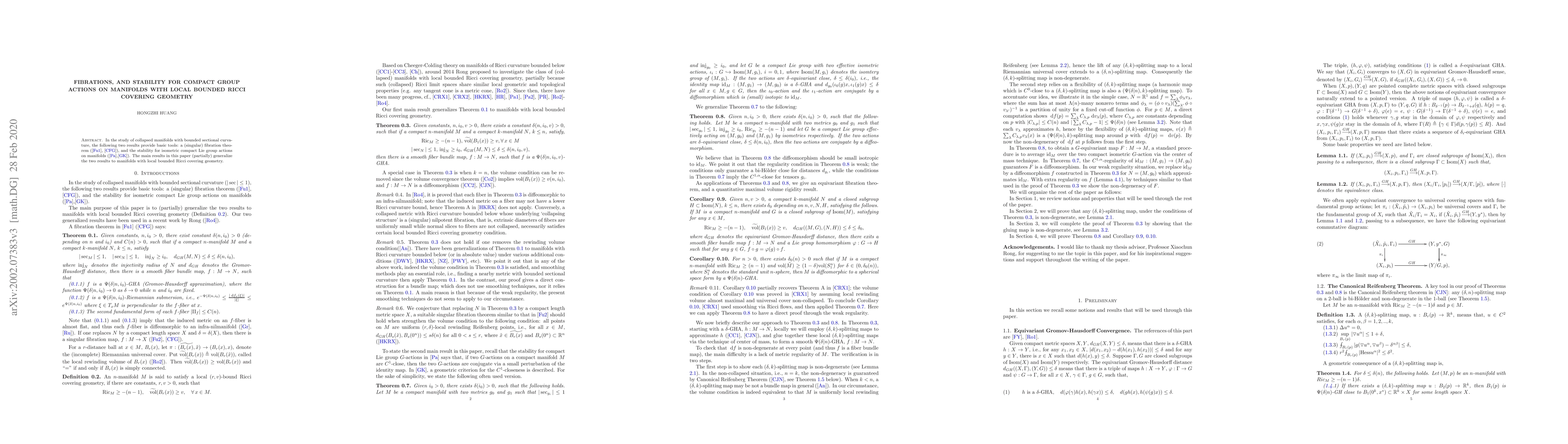 In this work, we (partially) generalize two classical tools in study of collapsed manifolds with bounded sectional curvature: a (singular) fibration theorem by Fukaya (1987) and Cheeger-Fukaya-Gromov (1992), and the stability for isometric compact Lie group actions on manifolds by Palais (1961) and Grove-Karcher (1973), to manifolds with local bounded Ricci covering geometry. Our two generalized results have been used in a recent work of Xiaochun Rong in generalizing Gromov's almost flat manifolds theorem to maximally collapsed manifolds with local bounded Ricci covering geometry.