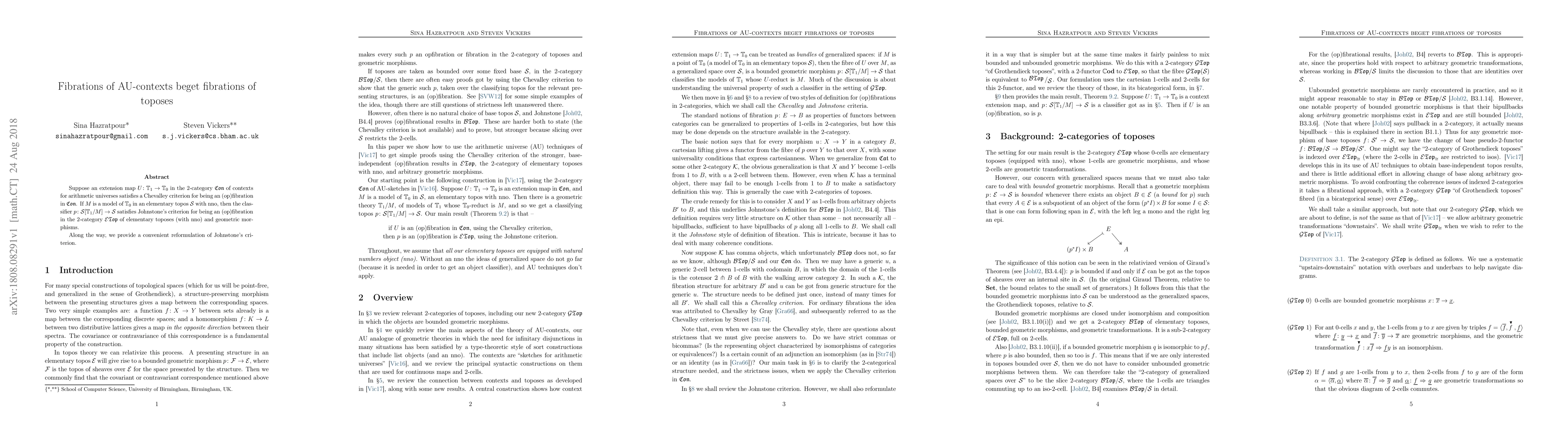 Suppose an extension map $U\colon \mathbb{T}_1 \to \mathbb{T}_0$ in the 2-category $\mathfrak{Con}$ of contexts for arithmetic universes satisfies a Chevalley criterion for being an (op)fibration in $\mathfrak{Con}$. If $M$ is a model of $\mathbb{T}_0$ in an elementary topos $\mathcal{S}$ with nno, then the classifier $p\colon\mathcal{S}[\mathbb{T}_1/M]\to\mathcal{S}$ satisfies Johnstone's criterion for being an (op)fibration in the 2-category $\mathcal{E}\mathfrak{Top}$ of elementary toposes (with nno) and geometric morphisms. Along the way, we provide a convenient reformulation of Johnstone's criterion.