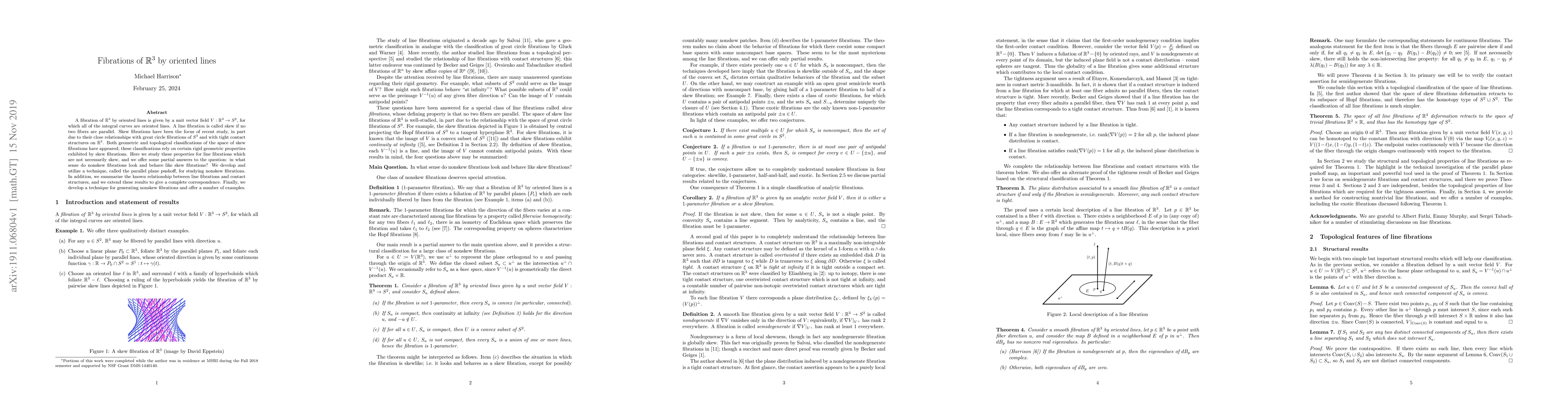 This paper explores fibrations of $\mathbb{R}^3$ by oriented lines, focusing on the geometric and topological properties of these fibrations, particularly for nonskew cases. It introduces the parallel plane pushoff technique and examines the relationship between such fibrations and contact structures, offering a complete correspondence and generating examples of nonskew fibrations.