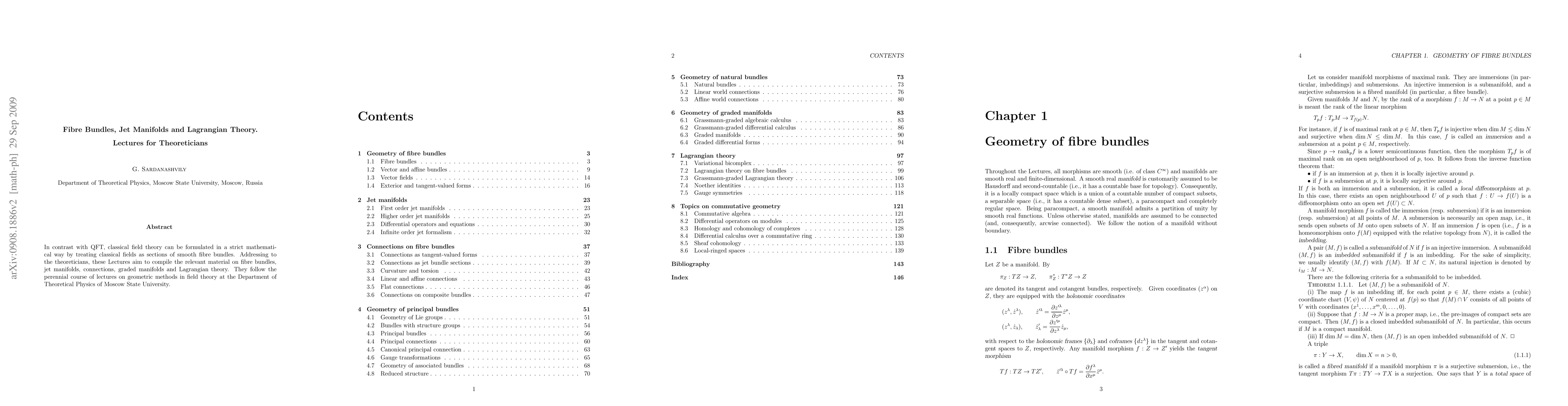 Summary: This paper provides a comprehensive overview of fibre bundles, jet manifolds, and Lagrangian theory for theoreticians, emphasizing the mathematical formulation of classical field theory. It compiles essential material on these geometric methods in field theory.