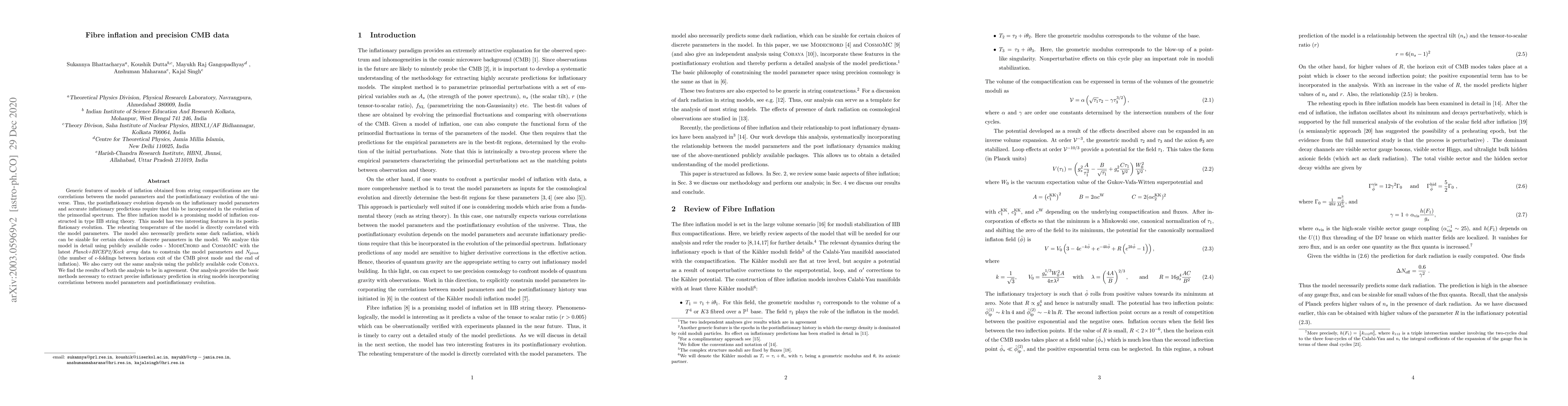 Generic features of models of inflation obtained from string compactifications are the correlations between the model parameters and the postinflationary evolution of the universe. Thus, the postinflationary evolution depends on the inflationary model parameters and accurate inflationary predictions require that this be incorporated in the evolution of the primordial spectrum. The fibre inflation model is a promising model of inflation constructed in type IIB string theory. This model has two interesting features in its postinflationary evolution. The reheating temperature of the model is directly correlated with the model parameters. The model also necessarily predicts some dark radiation, which can be sizable for certain choices of discrete parameters in the model. We analyze this model in detail using publicly available codes - ModeChord and CosmoMC with the latest Planck+BICEP2/Keck array data to constrain the model parameters and $N_{\rm pivot}$ (the number of $e$-foldings between horizon exit of the CMB pivot mode and the end of inflation). We also carry out the same analysis using the publicly available code Cobaya. We find the results of both the analysis to be in agreement. Our analysis provides the basic methods necessary to extract precise inflationary prediction in string models incorporating correlations between model parameters and postinflationary evolution.