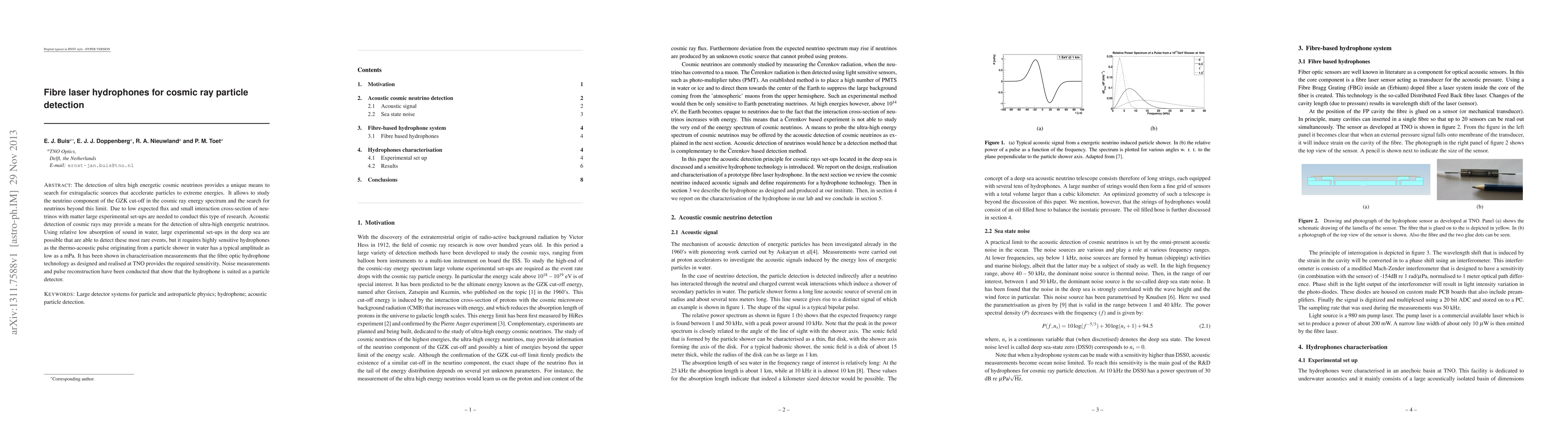 The detection of ultra high energetic cosmic neutrinos provides a unique means to search for extragalactic sources that accelerate particles to extreme energies. It allows to study the neutrino component of the GZK cut-off in the cosmic ray energy spectrum and the search for neutrinos beyond this limit. Due to low expected flux and small interaction cross-section of neutrinos with matter large experimental set-ups are needed to conduct this type of research. Acoustic detection of cosmic rays may provide a means for the detection of ultra-high energetic neutrinos. Using relative low absorption of sound in water, large experimental set-ups in the deep sea are possible that are able to detect these most rare events, but it requires highly sensitive hydrophones as the thermo-acoustic pulse originating from a particle shower in water has a typical amplitude as low as a mPa. It has been shown in characterisation measurements that the fibre optic hydrophone technology as designed and realised at TNO provides the required sensitivity. Noise measurements and pulse reconstruction have been conducted that show that the hydrophone is suited as a particle detector.