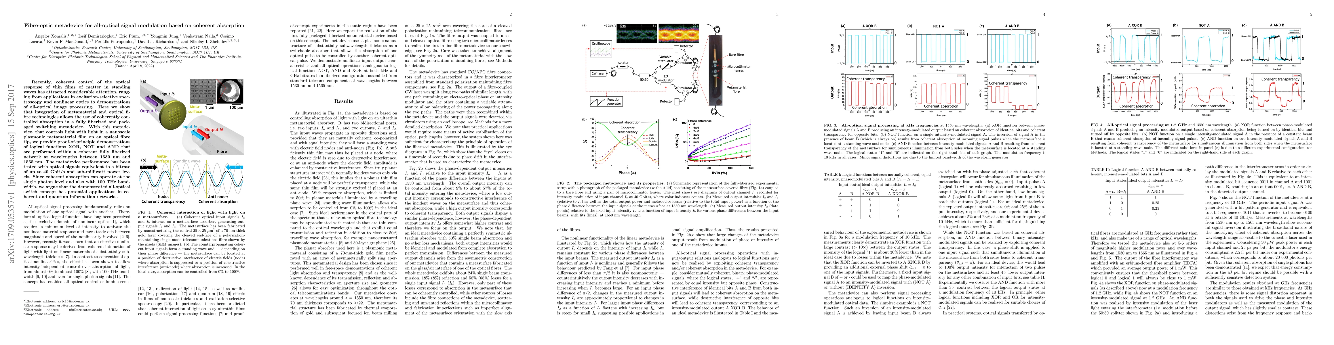 This paper presents a novel fibre-optic metadevice that uses coherent absorption in a nanoscale plasmonic metamaterial film for all-optical signal modulation, demonstrating logical functions XOR, NOT, and AND at bitrates up to 40 Gbit/s. The device's potential for single-photon operation and 100 THz bandwidth suggests its applicability in quantum information networks.