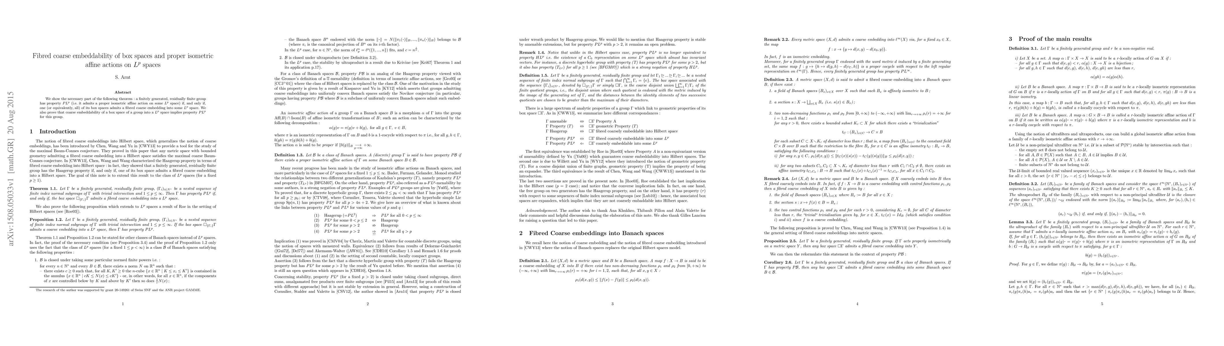 We show the necessary part of the following theorem : a finitely generated, residually finite group has property $PL^p$ (i.e. it admits a proper isometric affine action on some $L^p$ space) if, and only if, one (or equivalently, all) of its box spaces admits a fibred coarse embedding into some $L^p$ space. We also prove that coarse embeddability of a box space of a group into a $L^p$ space implies property $PL^p$ for this group.