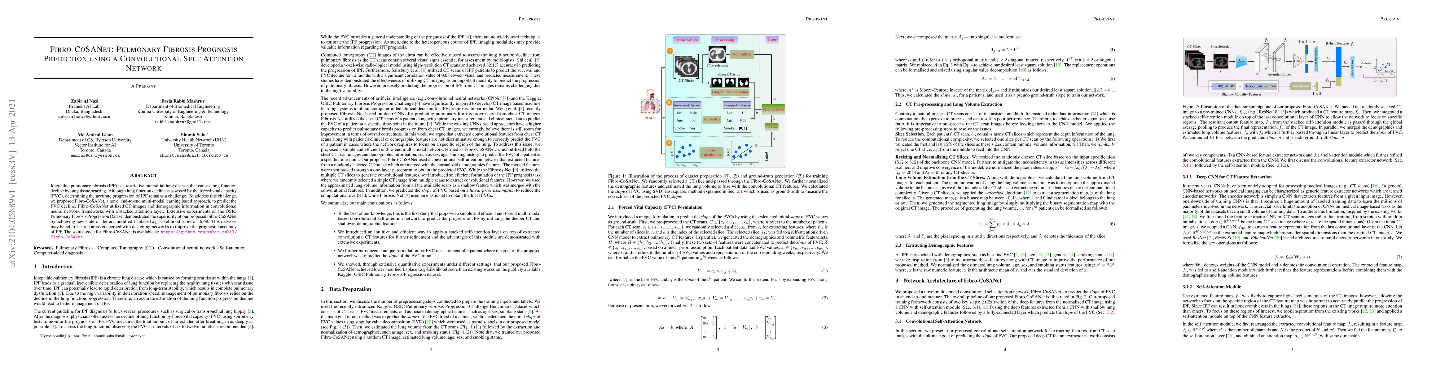 Fibro-CoSANet is a novel multi-modal learning approach using a convolutional self-attention network to predict the progression of idiopathic pulmonary fibrosis (IPF) by assessing forced vital capacity decline. The method achieved state-of-the-art results on the OSIC dataset, demonstrating improved prognostic accuracy.