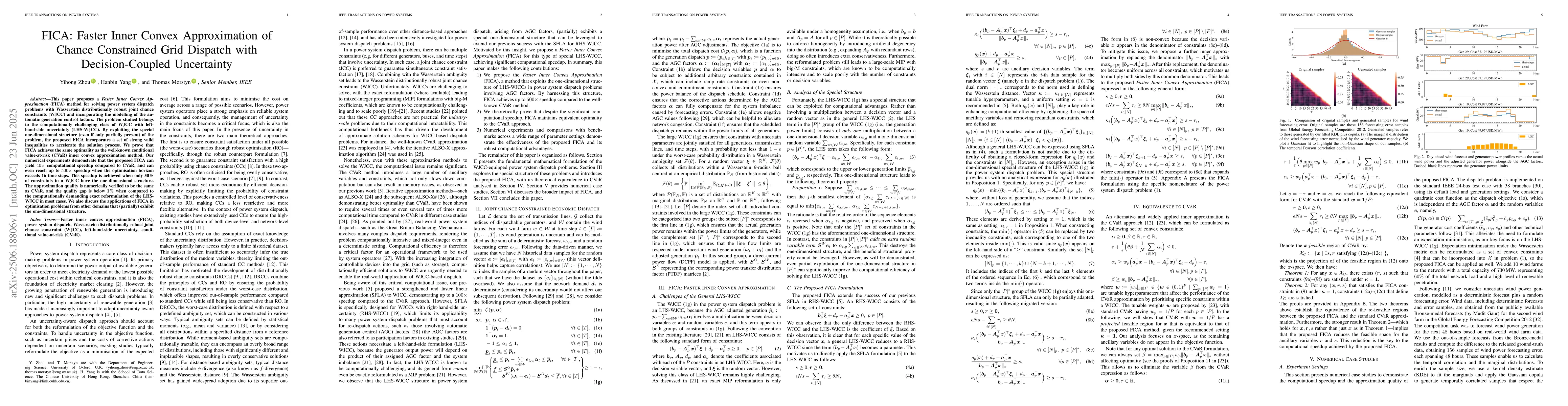The paper introduces FICA, a method for faster approximation of complex power system dispatch problems with uncertainty, achieving 40x to 500x speedup over existing methods with minimal loss in accuracy. It exploits a one-dimensional problem structure to add strong valid inequalities, proving optimality comparable to CVaR while offering significant computational efficiency gains.