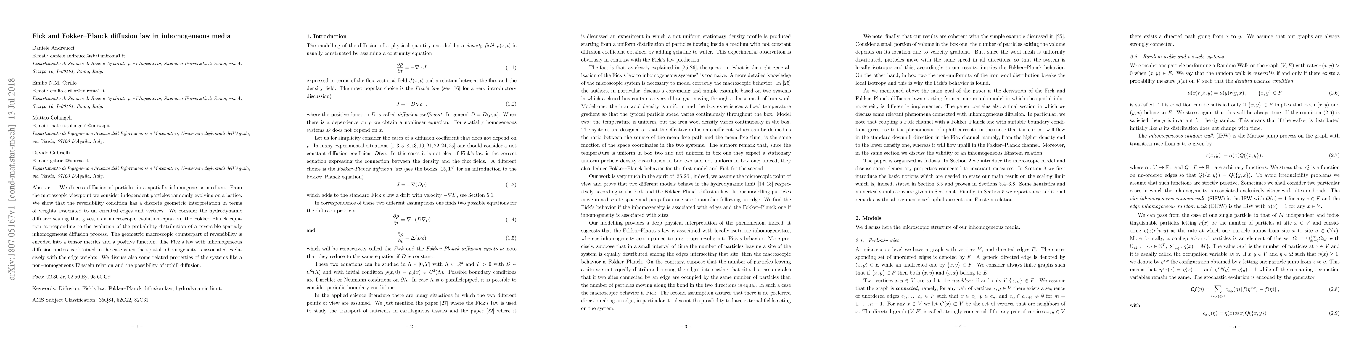 This paper explores particle diffusion in inhomogeneous media, deriving the Fokker-Planck equation from microscopic lattice models and demonstrating the reversibility condition's geometric interpretation. It also establishes Fick's law with an inhomogeneous diffusion matrix and discusses related properties such as non-homogeneous Einstein relations and uphill diffusion.
