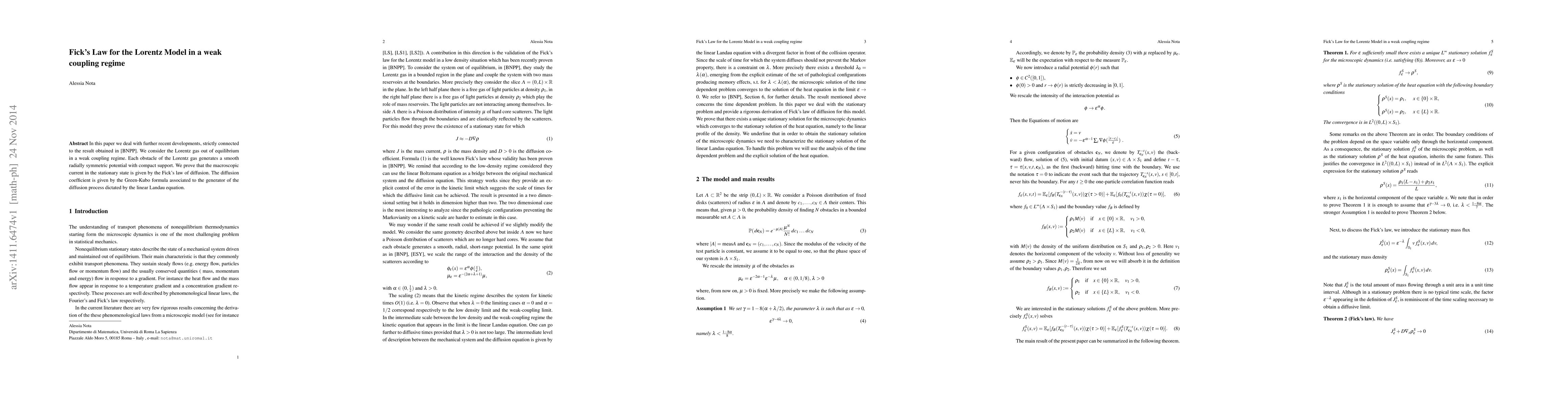 This paper proves that in a weak coupling regime, the macroscopic current in an out-of-equilibrium Lorentz gas follows Fick's law of diffusion, with a diffusion coefficient derived from the Green-Kubo formula.