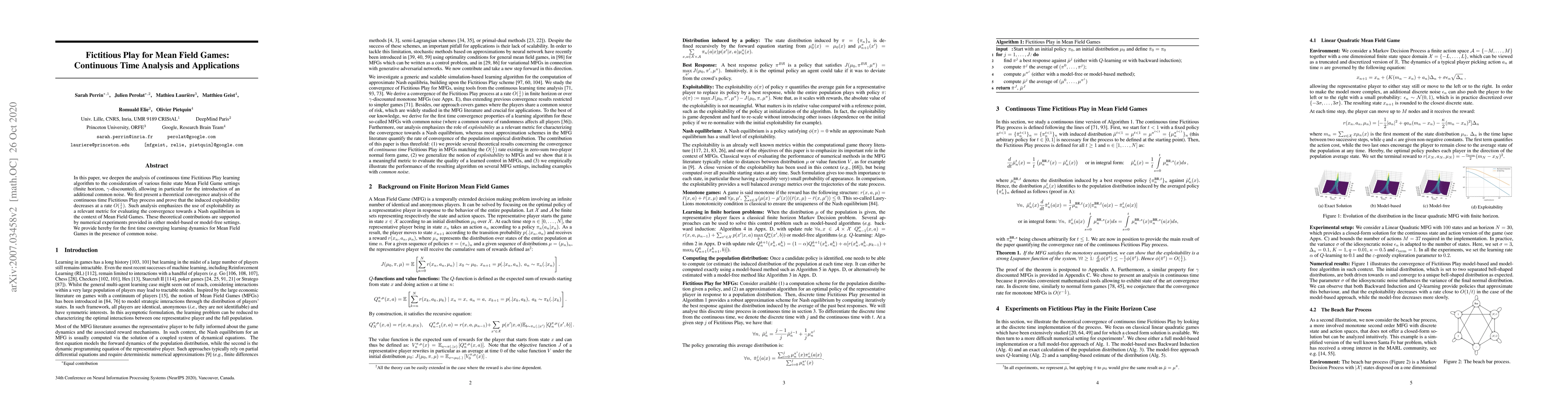 In this paper, we deepen the analysis of continuous time Fictitious Play learning algorithm to the consideration of various finite state Mean Field Game settings (finite horizon, $\gamma$-discounted), allowing in particular for the introduction of an additional common noise. We first present a theoretical convergence analysis of the continuous time Fictitious Play process and prove that the induced exploitability decreases at a rate $O(\frac{1}{t})$. Such analysis emphasizes the use of exploitability as a relevant metric for evaluating the convergence towards a Nash equilibrium in the context of Mean Field Games. These theoretical contributions are supported by numerical experiments provided in either model-based or model-free settings. We provide hereby for the first time converging learning dynamics for Mean Field Games in the presence of common noise.