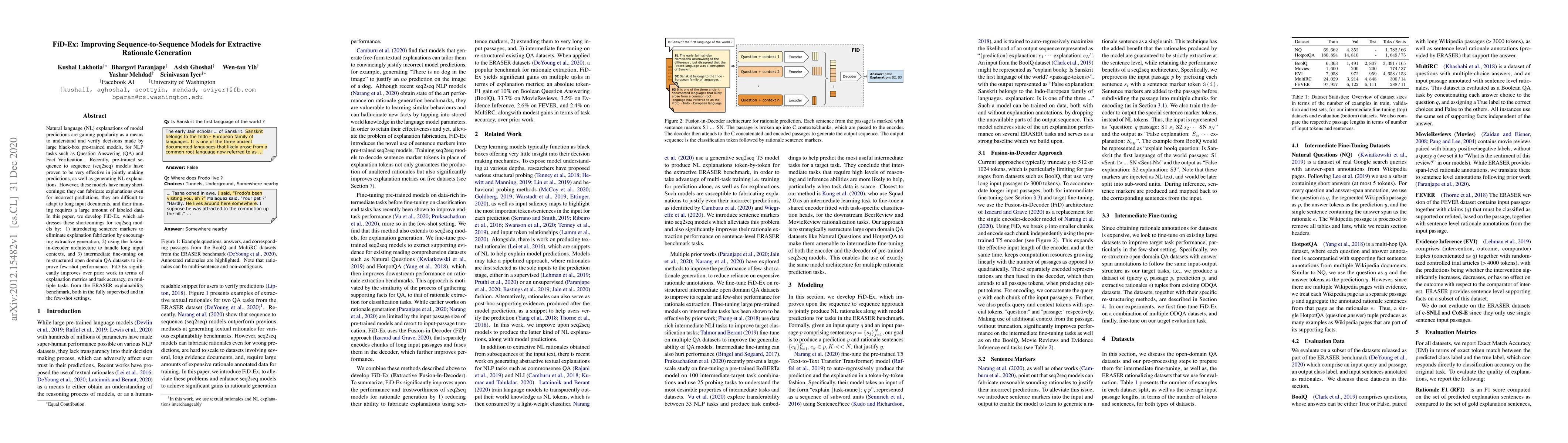 Natural language (NL) explanations of model predictions are gaining popularity as a means to understand and verify decisions made by large black-box pre-trained models, for NLP tasks such as Question Answering (QA) and Fact Verification. Recently, pre-trained sequence to sequence (seq2seq) models have proven to be very effective in jointly making predictions, as well as generating NL explanations. However, these models have many shortcomings; they can fabricate explanations even for incorrect predictions, they are difficult to adapt to long input documents, and their training requires a large amount of labeled data. In this paper, we develop FiD-Ex, which addresses these shortcomings for seq2seq models by: 1) introducing sentence markers to eliminate explanation fabrication by encouraging extractive generation, 2) using the fusion-in-decoder architecture to handle long input contexts, and 3) intermediate fine-tuning on re-structured open domain QA datasets to improve few-shot performance. FiD-Ex significantly improves over prior work in terms of explanation metrics and task accuracy, on multiple tasks from the ERASER explainability benchmark, both in the fully supervised and in the few-shot settings.