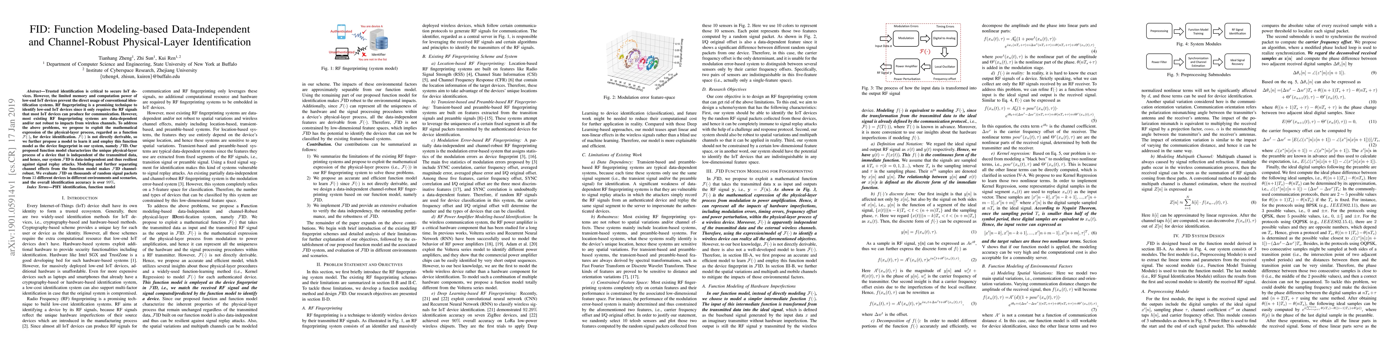 Trusted identification is critical to secure IoT devices. However, the limited memory and computation power of low-end IoT devices prevent the direct usage of conventional identification systems. RF fingerprinting is a promising technique to identify low-end IoT devices since it only requires the RF signals that most IoT devices can produce for communication. However, most existing RF fingerprinting systems are data-dependent and/or not robust to impacts from wireless channels. To address the above problems, we propose to exploit the mathematical expression of the physical-layer process, regarded as a function $\mathbf{\mathcal{F}(\cdot)}$, for device identification. $\mathbf{\mathcal{F}(\cdot)}$ is not directly derivable, so we further propose a model to learn it and employ this function model as the device fingerprint in our system, namely $\mathcal{F}$ID. Our proposed function model characterizes the unique physical-layer process of a device that is independent of the transmitted data, and hence, our system $\mathcal{F}$ID is data-independent and thus resilient against signal replay attacks. Modeling and further separating channel effects from the function model makes $\mathcal{F}$ID channel-robust. We evaluate $\mathcal{F}$ID on thousands of random signal packets from $33$ different devices in different environments and scenarios, and the overall identification accuracy is over $99\%$.