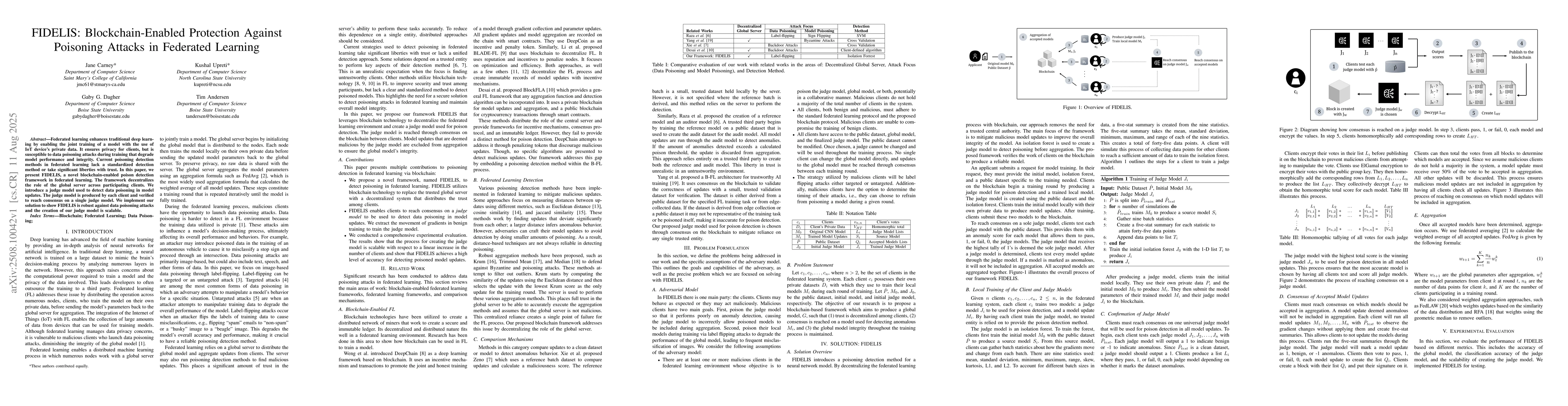 Federated learning enhances traditional deep learning by enabling the joint training of a model with the use of IoT device's private data. It ensures privacy for clients, but is susceptible to data poisoning attacks during training that degrade model performance and integrity. Current poisoning detection methods in federated learning lack a standardized detection method or take significant liberties with trust. In this paper, we present \Sys, a novel blockchain-enabled poison detection framework in federated learning. The framework decentralizes the role of the global server across participating clients. We introduce a judge model used to detect data poisoning in model updates. The judge model is produced by each client and verified to reach consensus on a single judge model. We implement our solution to show \Sys is robust against data poisoning attacks and the creation of our judge model is scalable.