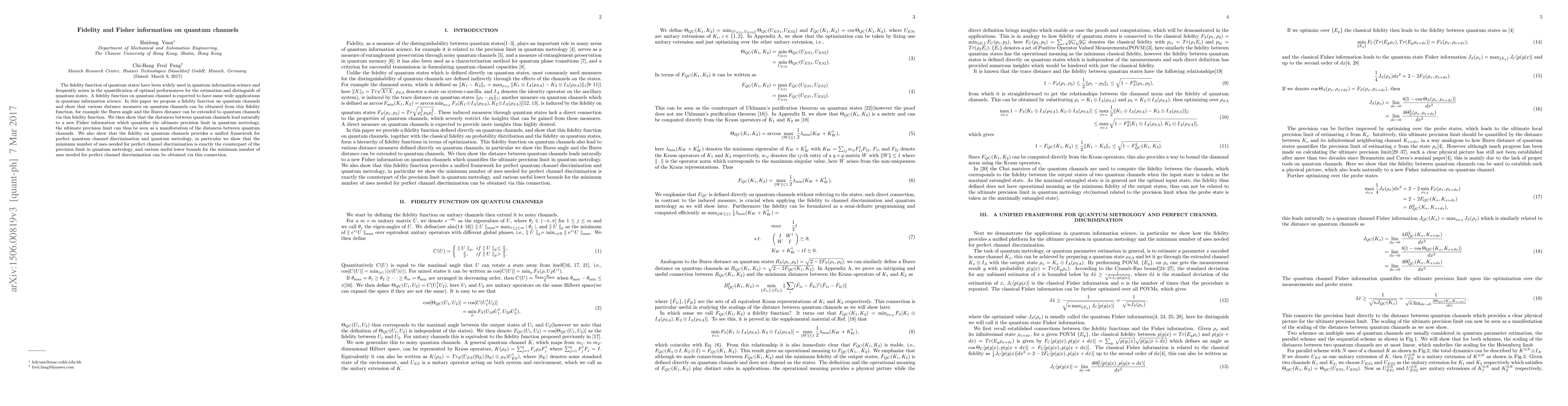 This paper proposes a fidelity function for quantum channels, demonstrating its application in deriving various distance measures like the Bures angle and distance. It also introduces a new Fisher information metric that quantifies the ultimate precision limit in quantum metrology, linking it to the minimum number of uses needed for perfect quantum channel discrimination.