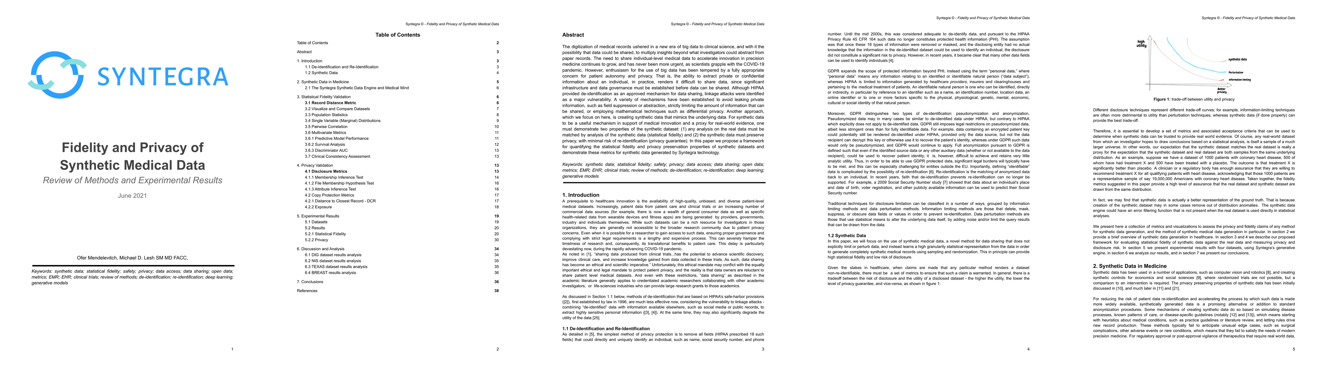 The digitization of medical records ushered in a new era of big data to clinical science, and with it the possibility that data could be shared, to multiply insights beyond what investigators could abstract from paper records. The need to share individual-level medical data to accelerate innovation in precision medicine continues to grow, and has never been more urgent, as scientists grapple with the COVID-19 pandemic. However, enthusiasm for the use of big data has been tempered by a fully appropriate concern for patient autonomy and privacy. That is, the ability to extract private or confidential information about an individual, in practice, renders it difficult to share data, since significant infrastructure and data governance must be established before data can be shared. Although HIPAA provided de-identification as an approved mechanism for data sharing, linkage attacks were identified as a major vulnerability. A variety of mechanisms have been established to avoid leaking private information, such as field suppression or abstraction, strictly limiting the amount of information that can be shared, or employing mathematical techniques such as differential privacy. Another approach, which we focus on here, is creating synthetic data that mimics the underlying data. For synthetic data to be a useful mechanism in support of medical innovation and a proxy for real-world evidence, one must demonstrate two properties of the synthetic dataset: (1) any analysis on the real data must be matched by analysis of the synthetic data (statistical fidelity) and (2) the synthetic data must preserve privacy, with minimal risk of re-identification (privacy guarantee). In this paper we propose a framework for quantifying the statistical fidelity and privacy preservation properties of synthetic datasets and demonstrate these metrics for synthetic data generated by Syntegra technology.