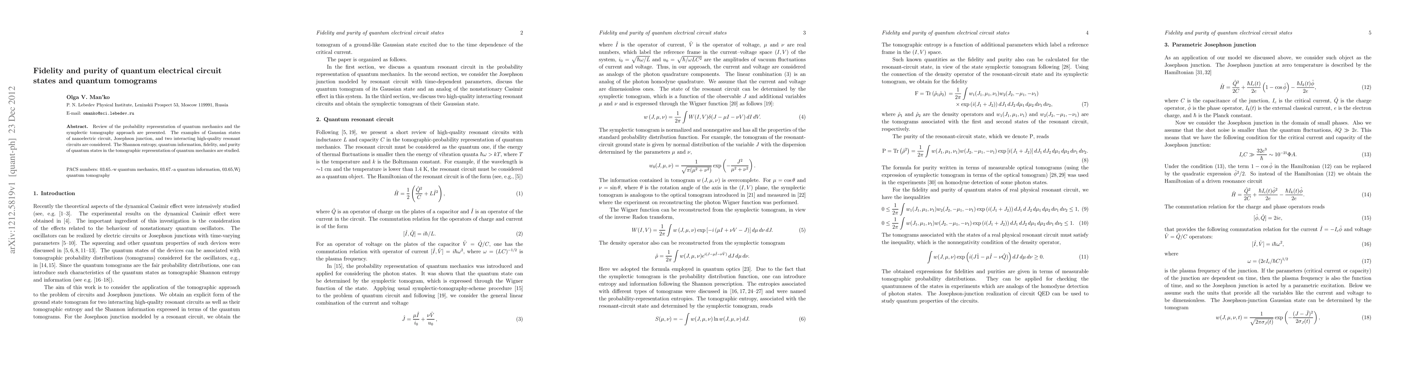 This paper reviews how to measure the accuracy of quantum states in electrical circuits using a method called symplectic tomography, and how this relates to concepts like Shannon entropy and quantum information.