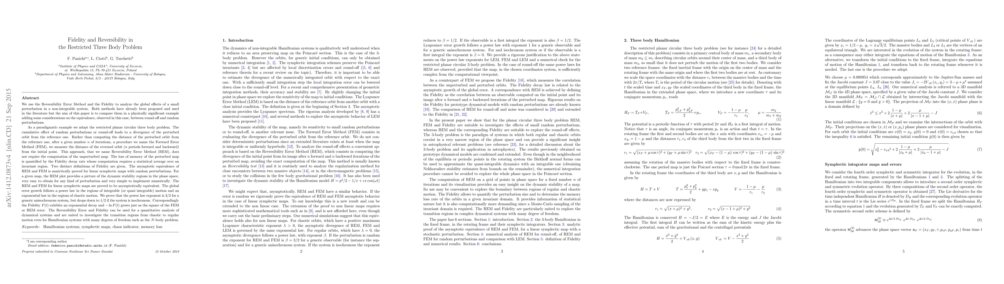 This paper compares the Reversibility Error Method and the Fidelity to analyze the global effects of small perturbations in the non-integrable restricted three body problem. It introduces the Reversibility Error Method, which measures the divergence of reversed orbits, and finds equivalence between round-off and random perturbations in fidelity decay.