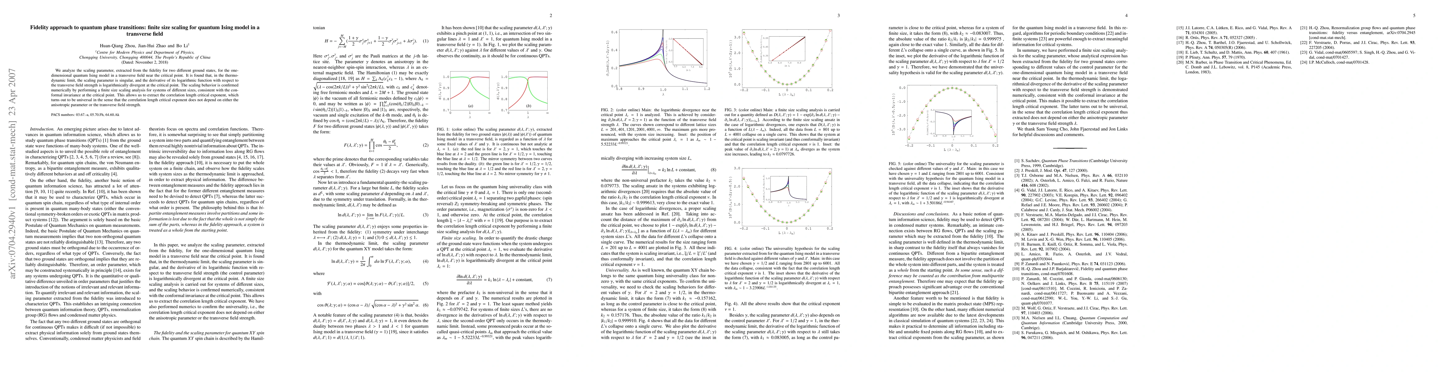 We analyze the scaling parameter, extracted from the fidelity for two different ground states, for the one-dimensional quantum Ising model in a transverse field near the critical point. It is found that, in the thermodynamic limit, the scaling parameter is singular, and the derivative of its logarithmic function with respect to the transverse field strength is logarithmically divergent at the critical point. The scaling behavior is confirmed numerically by performing a finite size scaling analysis for systems of different sizes, consistent with the conformal invariance at the critical point. This allows us to extract the correlation length critical exponent, which turns out to be universal in the sense that the correlation length critical exponent does not depend on either the anisotropic parameter or the transverse field strength.