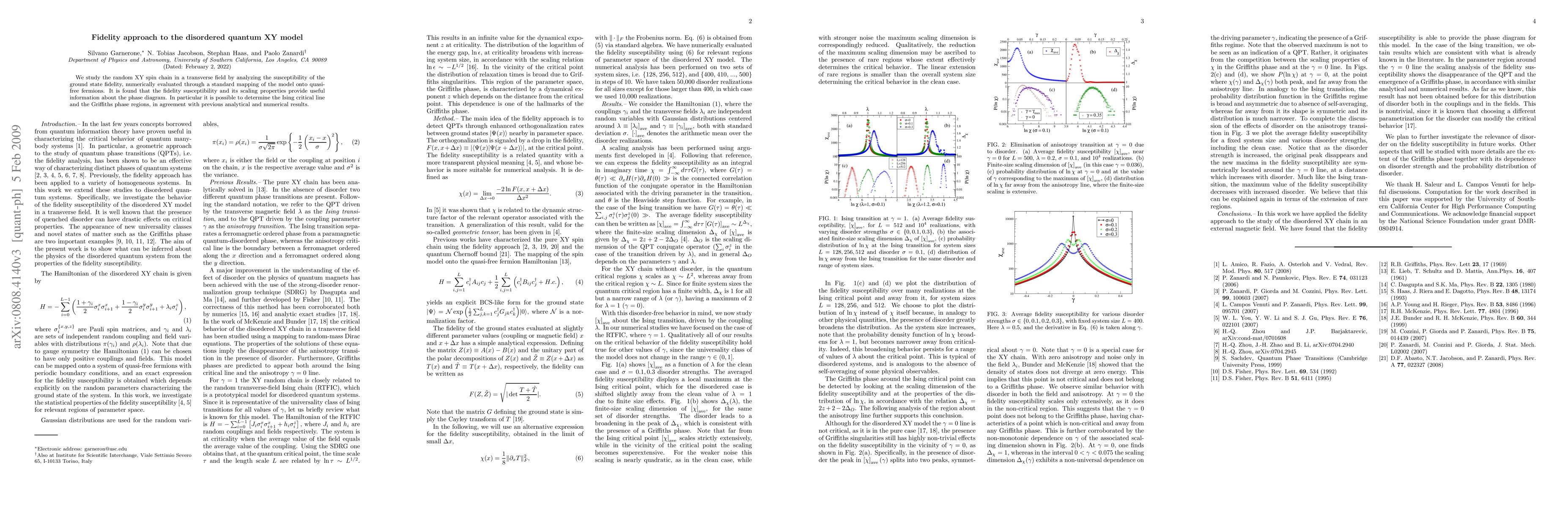 The paper studies the random XY spin chain in a transverse field using numerical methods, finding that the ground state fidelity susceptibility provides useful information about the phase diagram, including the Ising critical line and Griffiths phase regions.