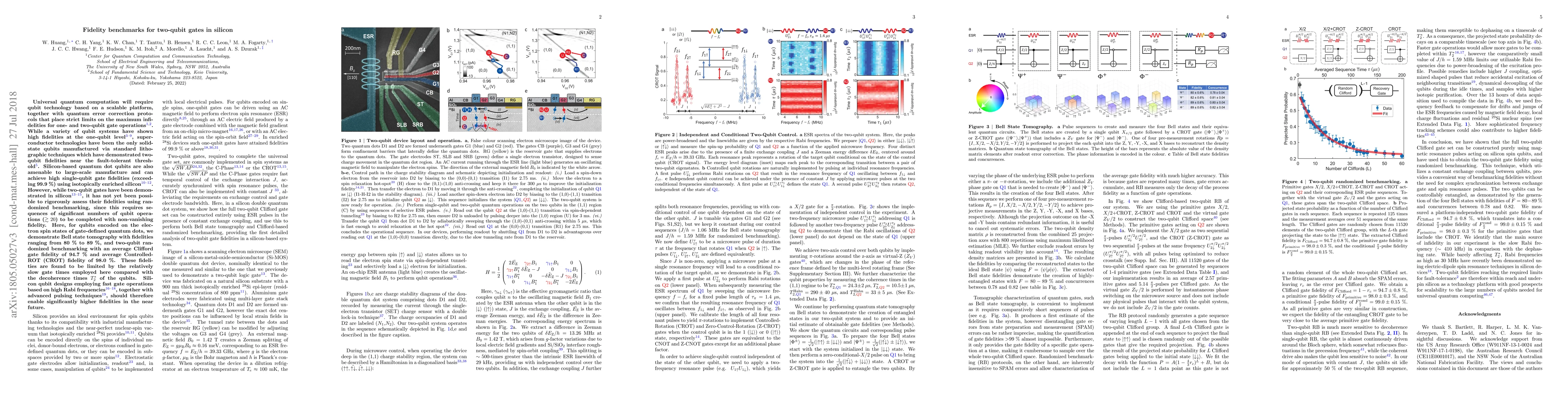 The study benchmarks two-qubit gate fidelities for silicon quantum dot qubits, achieving Bell state tomography fidelities between 80% to 89% and randomized benchmarking fidelities of 94.7% for Clifford gates and 98.0% for Controlled-ROT gates. Future improvements in gate speed are projected to further enhance these fidelities.