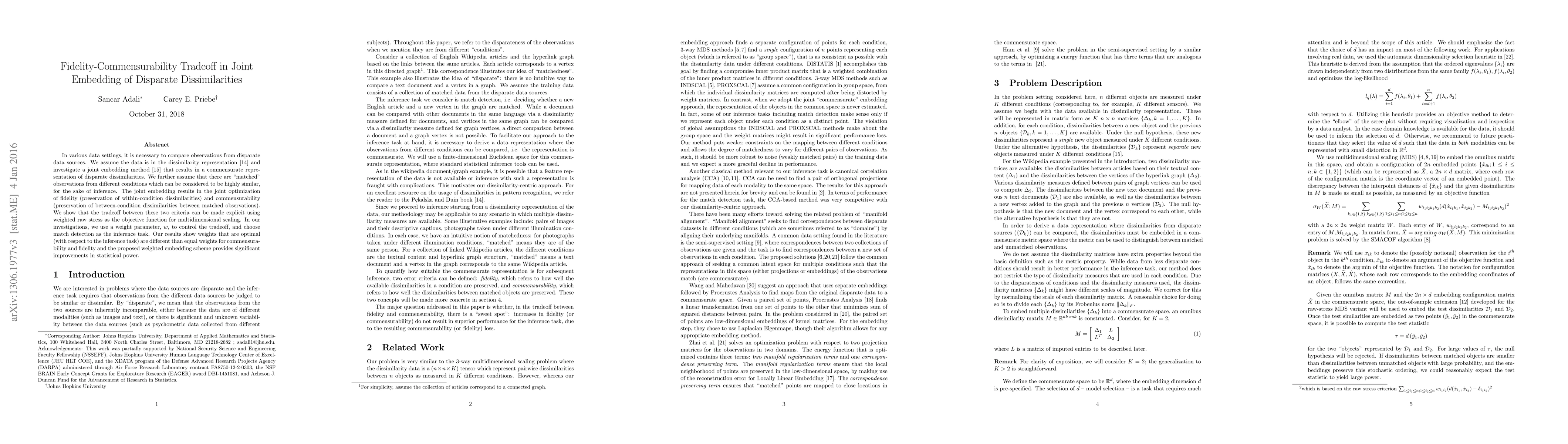 This paper explores a joint embedding method for disparate dissimilarities, optimizing both fidelity and commensurability through a weighted raw stress objective function. The study finds that optimal weights for inference differ from equal weights, enhancing statistical power.