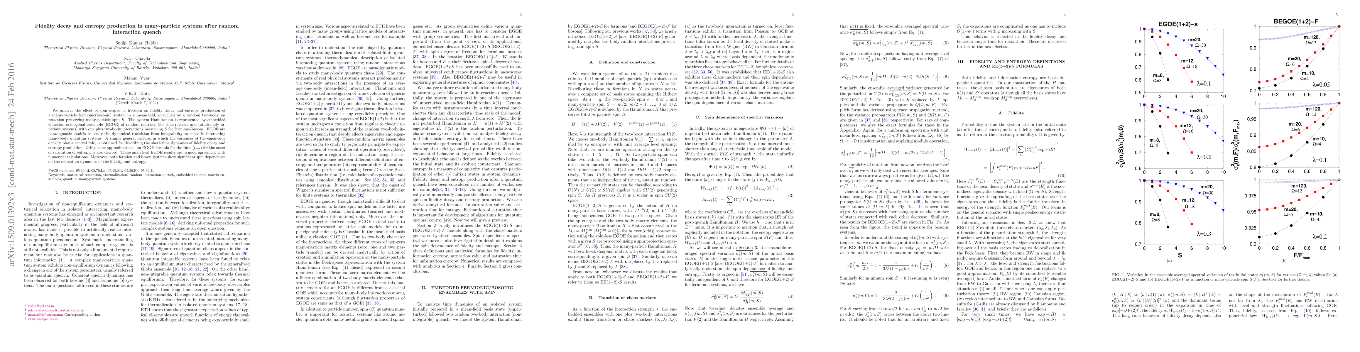 This paper investigates the fidelity decay and entropy production in many-particle fermionic and bosonic systems following a random interaction quench, revealing that spin degree of freedom significantly influences these dynamics. Analytical results derived from the embedded Gaussian orthogonal ensemble (EGOE) model show good agreement with numerical simulations, highlighting the role of eigenvalue density variances in short-time dynamics and the saturation time of entropy.