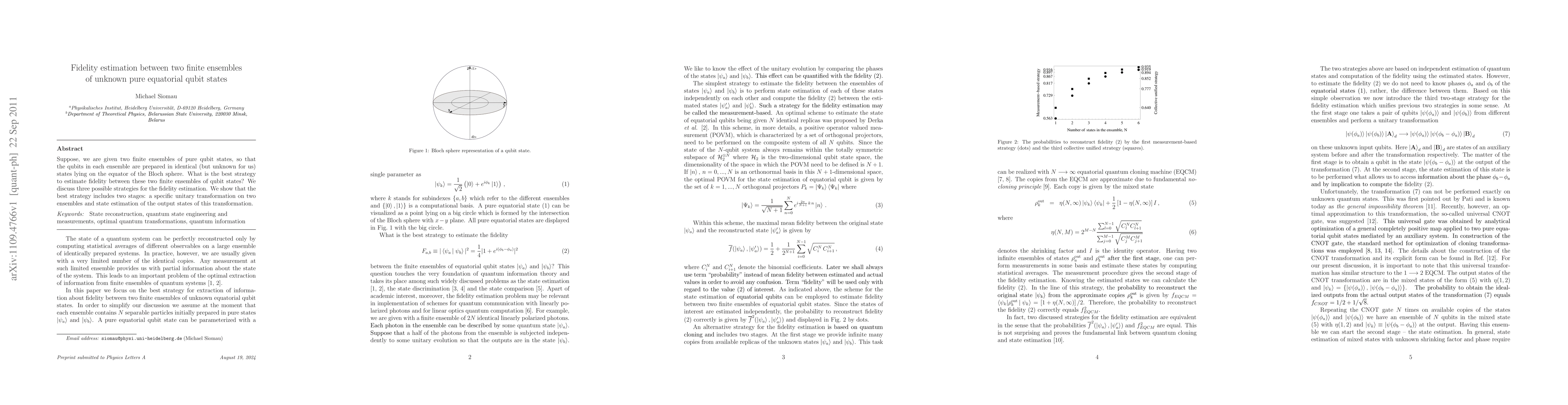 The paper explores strategies for estimating fidelity between two finite ensembles of unknown pure equatorial qubit states, proposing a two-stage method involving unitary transformation and state estimation.