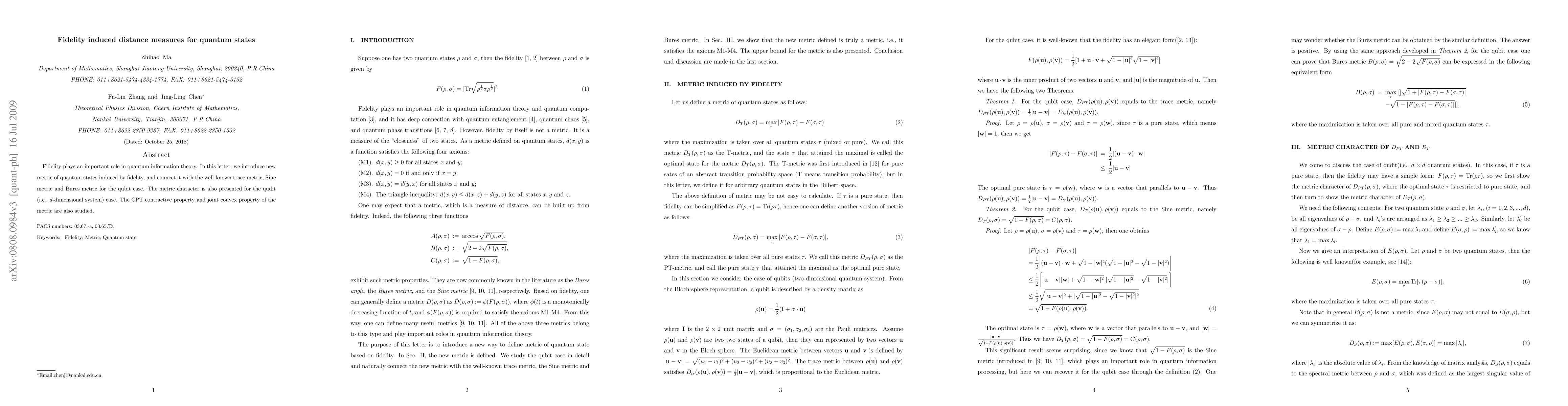 Fidelity plays an important role in quantum information theory. In this letter, we introduce new metric of quantum states induced by fidelity, and connect it with the well-known trace metric, Sine metric and Bures metric for the qubit case. The metric character is also presented for the qudit (i.e., $d$-dimensional system) case. The CPT contractive property and joint convex property of the metric are also studied.