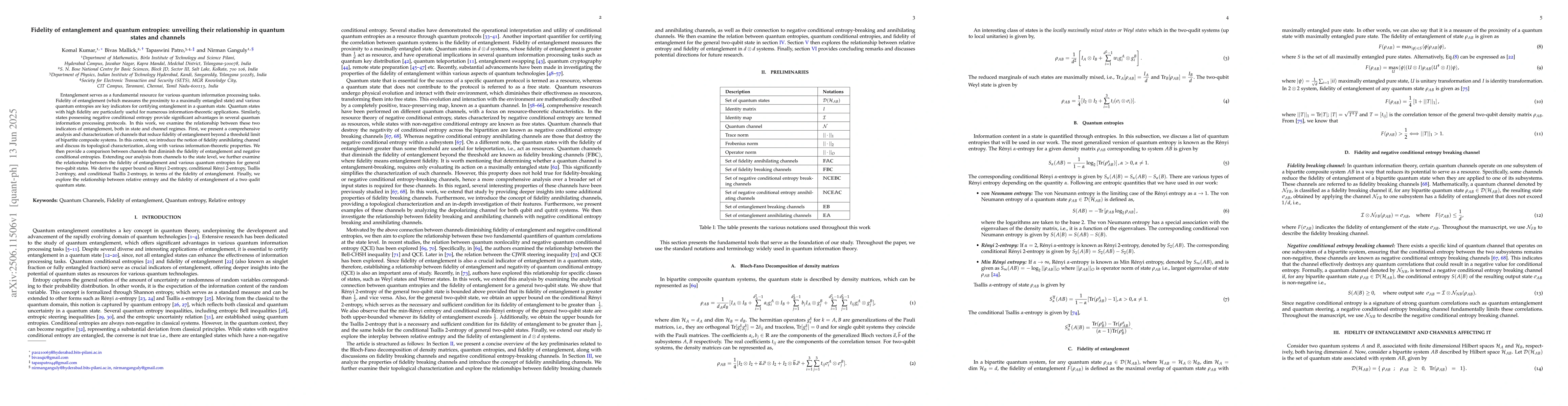 Entanglement serves as a fundamental resource for various quantum information processing tasks. Fidelity of entanglement (which measures the proximity to a maximally entangled state) and various quantum entropies are key indicators for certifying entanglement in a quantum state. Quantum states with high fidelity are particularly useful for numerous information-theoretic applications. Similarly, states possessing negative conditional entropy provide significant advantages in several quantum information processing protocols. In this work, we examine the relationship between these two indicators of entanglement, both in state and channel regimes. First, we present a comprehensive analysis and characterization of channels that reduce fidelity of entanglement beyond a threshold limit of bipartite composite systems. In this context, we introduce the notion of fidelity annihilating channel and discuss its topological characterization, along with various information-theoretic properties. We then provide a comparison between channels that diminish the fidelity of entanglement and negative conditional entropies. Extending our analysis from channels to the state level, we further examine the relationship between the fidelity of entanglement and various quantum entropies for general two-qubit states. We derive the upper bound on R\'enyi 2-entropy, conditional R\'enyi 2-entropy, Tsallis 2-entropy, and conditional Tsallis 2-entropy, in terms of the fidelity of entanglement. Finally, we explore the relationship between relative entropy and the fidelity of entanglement of a two qudit quantum state.