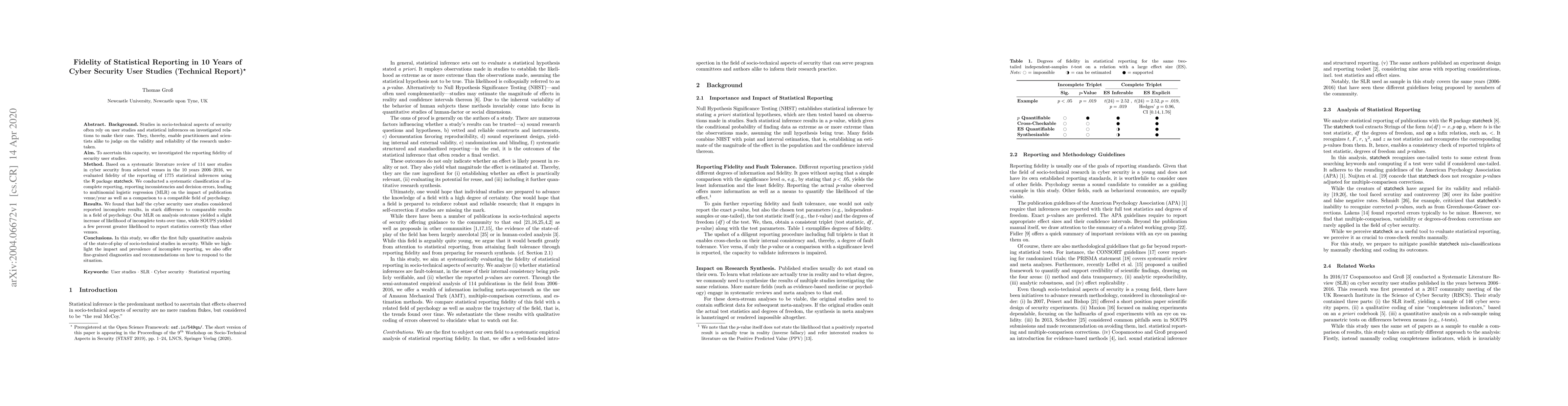 Studies in socio-technical aspects of security often rely on user studies and statistical inferences on investigated relations to make their case. They, thereby, enable practitioners and scientists alike to judge on the validity and reliability of the research undertaken. To ascertain this capacity, we investigated the reporting fidelity of security user studies. Based on a systematic literature review of $114$ user studies in cyber security from selected venues in the 10 years 2006--2016, we evaluated fidelity of the reporting of $1775$ statistical inferences using the \textsf{R} package \textsf{statcheck}. We conducted a systematic classification of incomplete reporting, reporting inconsistencies and decision errors, leading to multinomial logistic regression (MLR) on the impact of publication venue/year as well as a comparison to a compatible field of psychology. We found that half the cyber security user studies considered reported incomplete results, in stark difference to comparable results in a field of psychology. Our MLR on analysis outcomes yielded a slight increase of likelihood of incomplete tests over time, while SOUPS yielded a few percent greater likelihood to report statistics correctly than other venues. In this study, we offer the first fully quantitative analysis of the state-of-play of socio-technical studies in security. While we highlight the impact and prevalence of incomplete reporting, we also offer fine-grained diagnostics and recommendations on how to respond to the situation.