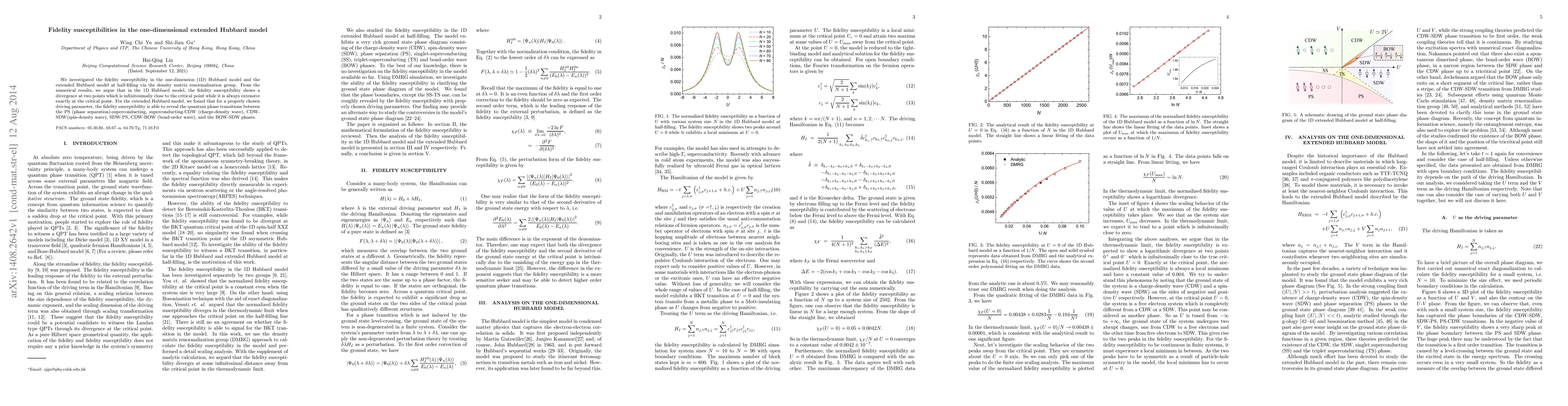 We investigated the fidelity susceptibility in the one-dimension (1D) Hubbard model and the extended Hubbard model at half-filling via the density matrix renormalization group. From the numerical results, we argue that in the 1D Hubbard model, the fidelity susceptibility shows a divergence at two points which is infinitesimally close to the critical point while it is always extensive exactly at the critical point. For the extended Hubbard model, we found that for a properly chosen driving parameter, the fidelity susceptibility is able to reveal the quantum phase transitions between the PS (phase separation)-superconducting, superconducting-CDW (charge-density wave), CDW-SDW(spin-density wave), SDW-PS, CDW-BOW (bond-order wave), and the BOW-SDW phases.