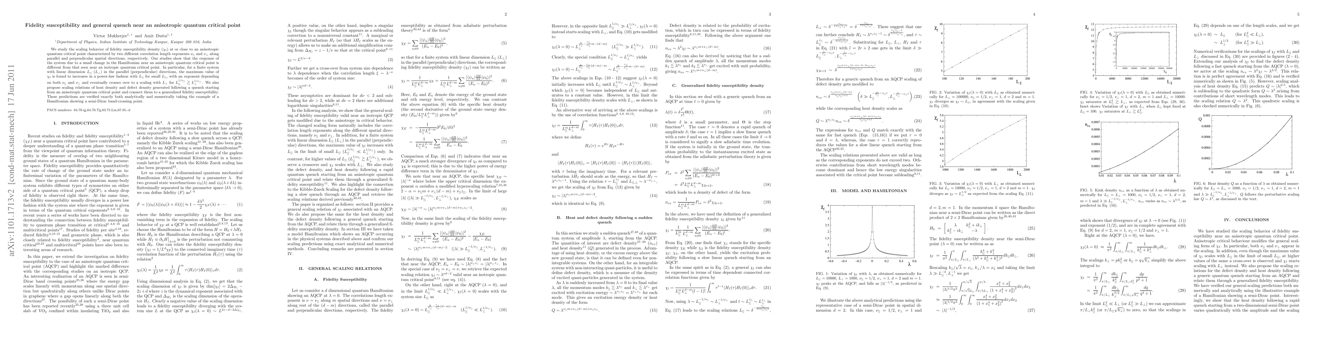 We study the scaling behavior of fidelity susceptibility density $(\chi_{\rm f})$ at or close to an anisotropic quantum critical point characterized by two different correlation length exponents $\nu_{||}$ and $\nu_{\bot}$ along parallel and perpendicular spatial directions, respectively. Our studies show that the response of the system due to a small change in the Hamiltonian near an anisotropic quantum critical point is different from that seen near an isotropic quantum critical point. In particular, for a finite system with linear dimension $L_{||}$ ($L_{\bot}$) in the parallel (perpendicular) directions, the maximum value of $\chi_{\rm f}$ is found to increases in a power-law fashion with $L_{||}$ for small $L_{||}$, with an exponent depending on both $\nu_{||}$ and $\nu_{\bot}$ and eventually crosses over to a scaling with $L_{\bot}$ for $L_{||}^{1/\nu_{||}} \gtrsim L_{\bot}^{1/\nu_{\bot}}$. We also propose scaling relations of heat density and defect density generated following a quench starting from an anisotropic quantum critical point and connect them to a generalized fidelity susceptibility. These predictions are verified exactly both analytically and numerically taking the example of a Hamiltonian showing a semi-Dirac band-crossing point.
