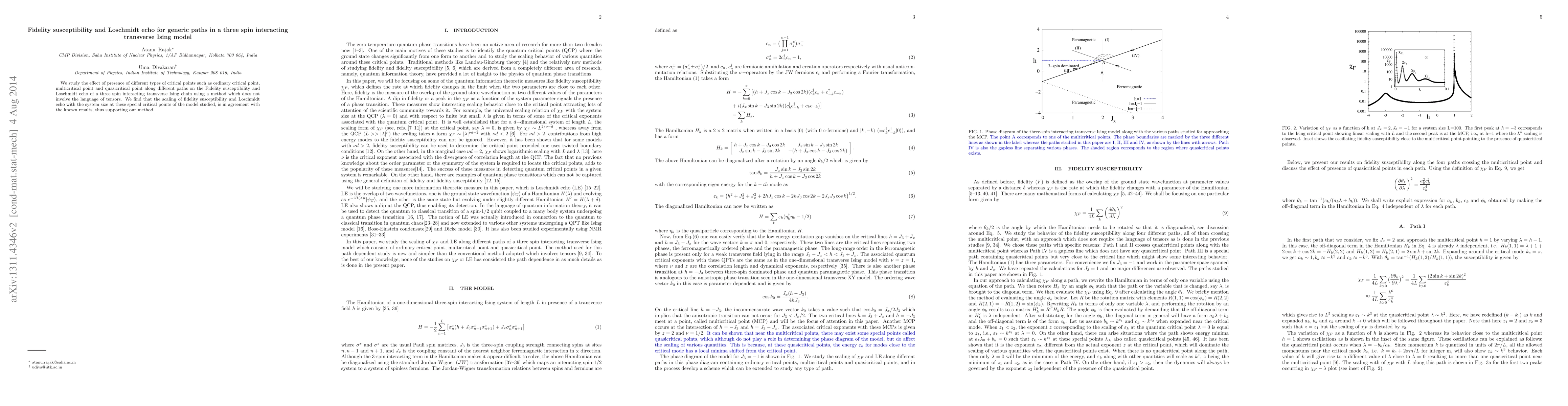 This paper investigates the fidelity susceptibility and Loschmidt echo in a three-spin transverse Ising model across various critical points, confirming the scaling behavior with system size and validating the employed method. The study supports the method's accuracy by aligning with known results for these critical points.