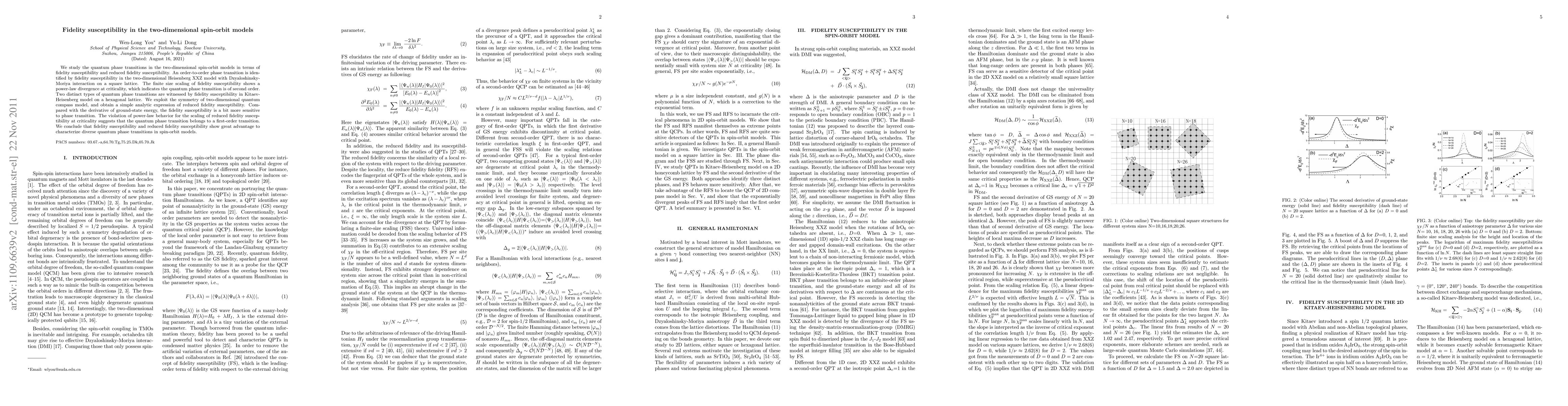 This paper investigates quantum phase transitions in two-dimensional spin-orbit models using fidelity susceptibility and reduced fidelity susceptibility. It identifies second-order transitions in the Heisenberg XXZ model and first-order transitions in the Kitaev-Heisenberg model, demonstrating the utility of these measures in characterizing diverse quantum phase transitions.