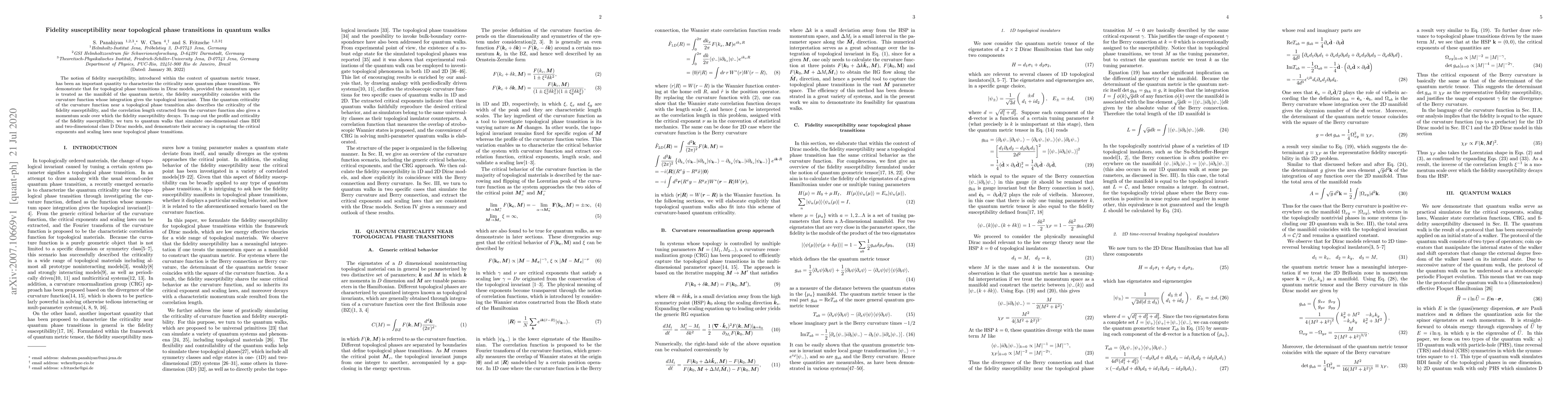 This research investigates the fidelity susceptibility near topological phase transitions in quantum walks, showing that it aligns with the curvature function, which integrates to the topological invariant. Quantum walks effectively simulate Dirac models, capturing critical exponents and scaling laws near these transitions.