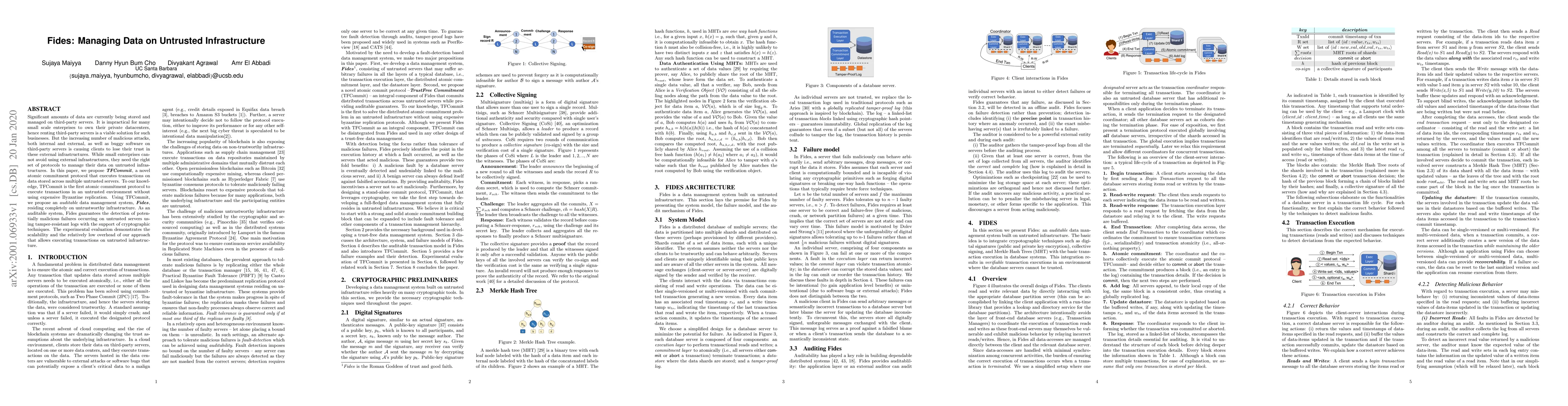This paper proposes TFCommit, an atomic commitment protocol for executing transactions on data stored across multiple untrusted servers, and Fides, an auditable data management system that leverages TFCommit to detect malicious failures on untrusted infrastructures using tamper-resistant logs and cryptographic techniques. Experimental results show the scalability and low overhead of TFCommit.