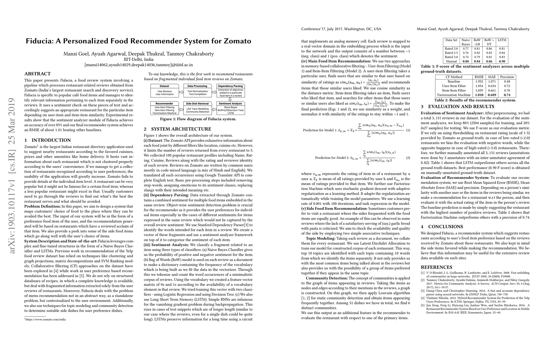 This paper presents Fiducia, a food review system involving a pipeline which processes restaurant-related reviews obtained from Zomato (India's largest restaurant search and discovery service). Fiducia is specific to popular cafe food items and manages to identify relevant information pertaining to each item separately in the reviews. It uses a sentiment check on these pieces of text and accordingly suggests an appropriate restaurant for the particular item depending on user-item and item-item similarity. Experimental results show that the sentiment analyzer module of Fiducia achieves an accuracy of over 85% and our final recommender system achieves an RMSE of about 1.01 beating other baselines.