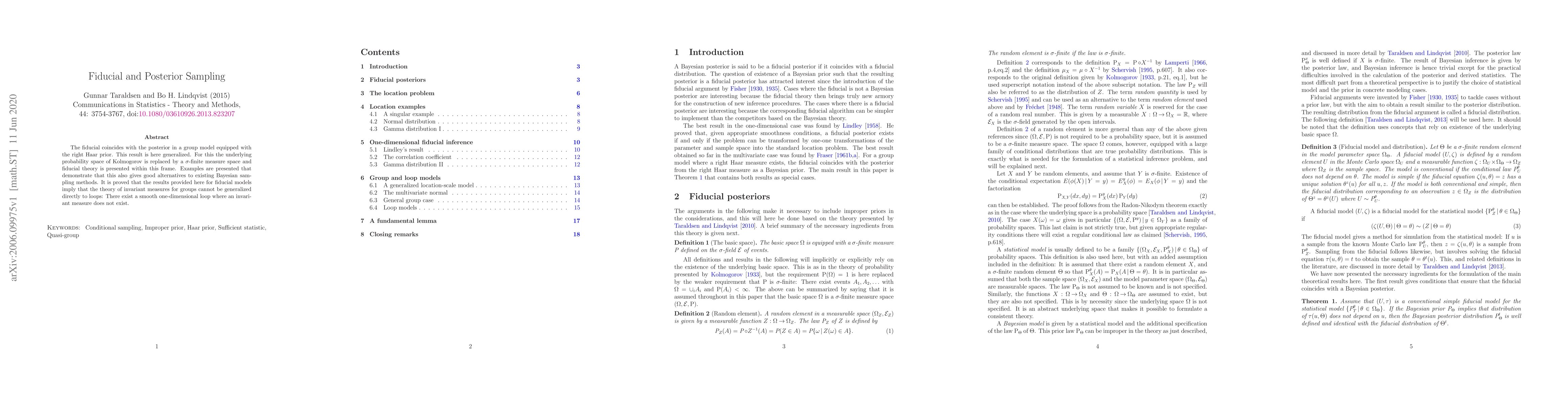 The fiducial coincides with the posterior in a group model equipped with the right Haar prior. This result is here generalized. For this the underlying probability space of Kolmogorov is replaced by a $\sigma$-finite measure space and fiducial theory is presented within this frame. Examples are presented that demonstrate that this also gives good alternatives to existing Bayesian sampling methods. It is proved that the results provided here for fiducial models imply that the theory of invariant measures for groups cannot be generalized directly to loops: There exist a smooth one-dimensional loop where an invariant measure does not exist. Keywords: Conditional sampling, Improper prior, Haar prior, Sufficient statistic, Quasi-group