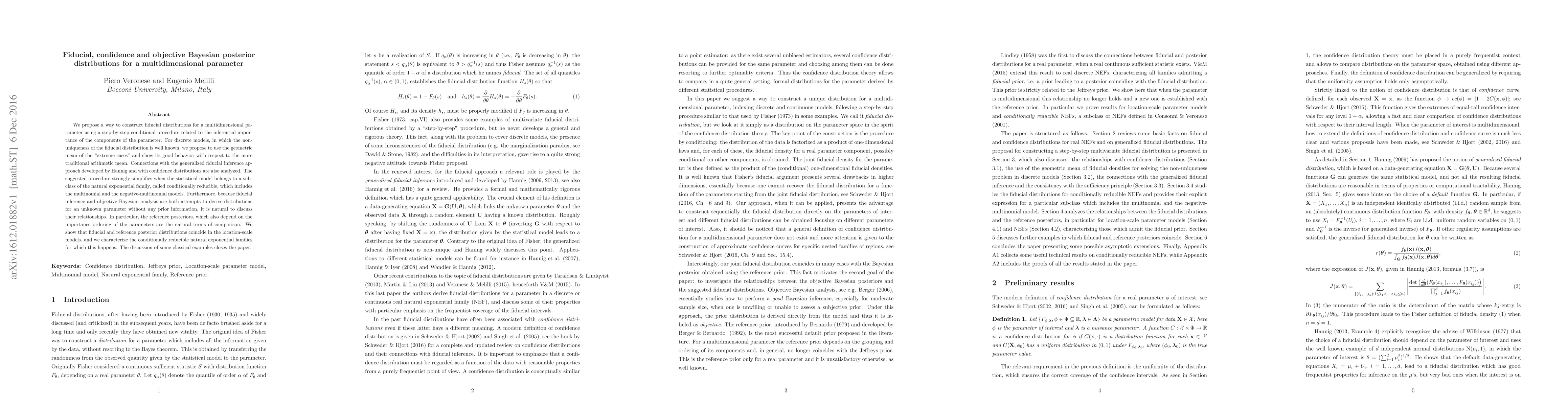We propose a way to construct fiducial distributions for a multidimensional parameter using a step-by-step conditional procedure related to the inferential importance of the components of the parameter. For discrete models, in which the non-uniqueness of the fiducial distribution is well known, we propose to use the geometric mean of the "extreme cases" and show its good behavior with respect to the more traditional arithmetic mean. Connections with the generalized fiducial inference approach developed by Hannig and with confidence distributions are also analyzed. The suggested procedure strongly simplifies when the statistical model belongs to a subclass of the natural exponential family, called conditionally reducible, which includes the multinomial and the negative-multinomial models. Furthermore, because fiducial inference and objective Bayesian analysis are both attempts to derive distributions for an unknown parameter without any prior information, it is natural to discuss their relationships. In particular, the reference posteriors, which also depend on the importance ordering of the parameters are the natural terms of comparison. We show that fiducial and reference posterior distributions coincide in the location-scale models, and we characterize the conditionally reducible natural exponential families for which this happens. The discussion of some classical examples closes the paper.