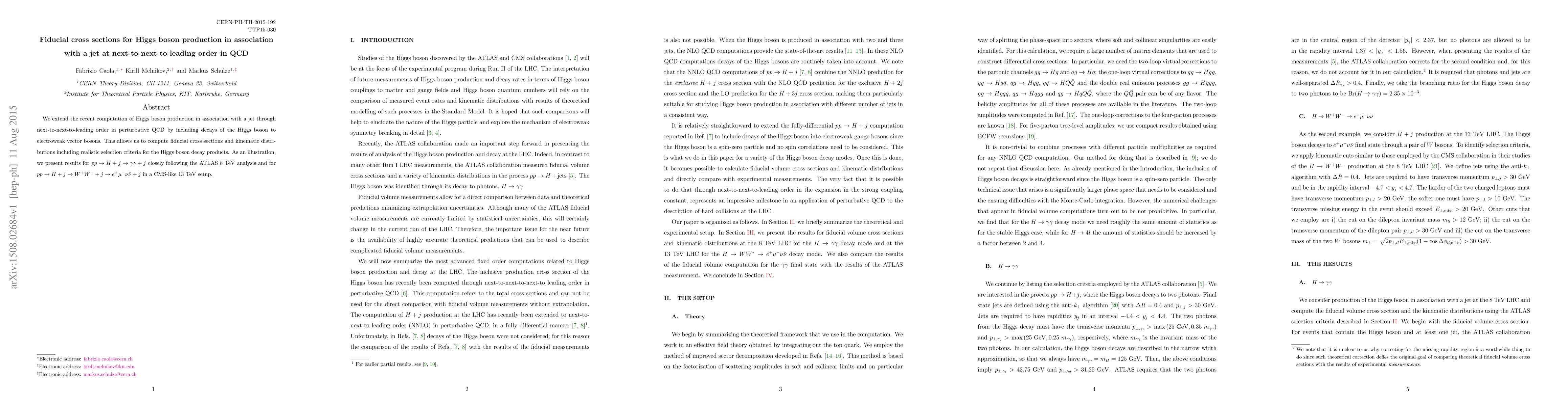 This paper computes next-to-next-to-leading order QCD corrections for Higgs boson production with a jet, including Higgs decays to electroweak vector bosons. It presents fiducial cross sections and distributions for specific decay channels, such as $pp \to H + j \to \gamma \gamma + j$ and $pp \to H + j \to W W + j \to e^+ \mu^- \nu \bar \nu + j$.