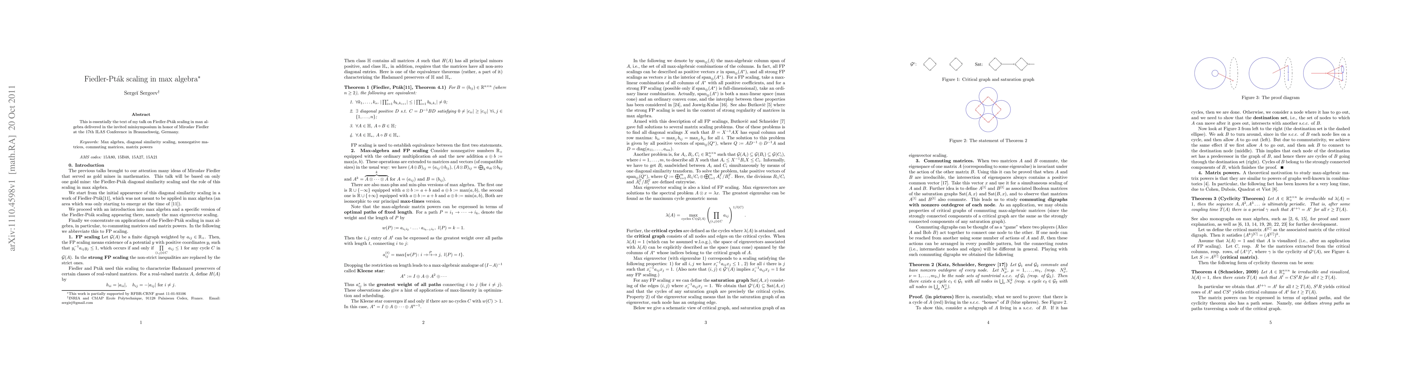 This is essentially the text of my talk on Fiedler-Ptak scaling in max algebra delivered in the invited minisymposium in honor of Miroslav Fiedler at the 17th ILAS Conference in Braunschweig, Germany.