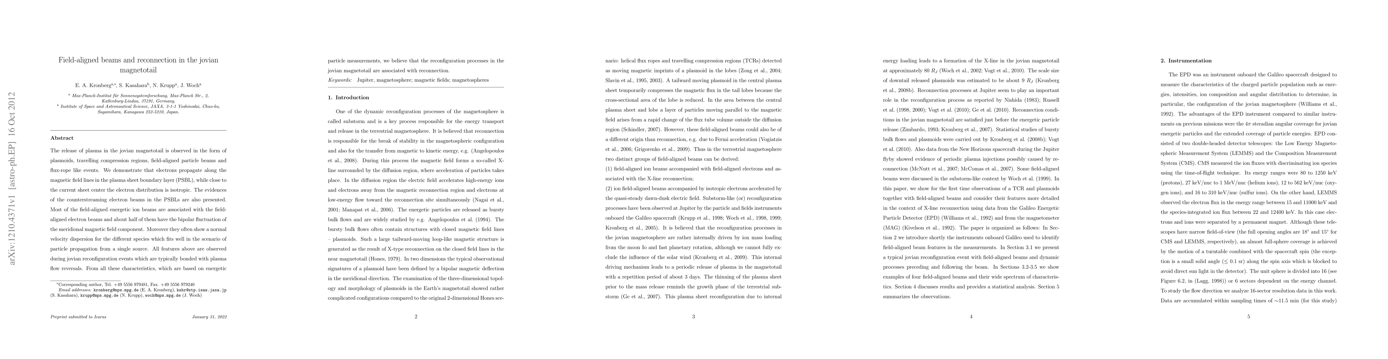This paper investigates plasma dynamics in the jovian magnetotail, highlighting the propagation of electrons along magnetic field lines in the plasma sheet boundary layer and the presence of counterstreaming electron beams. It concludes that reconnection processes in the jovian magnetotail are linked to these field-aligned beams and associated energetic particle phenomena.
